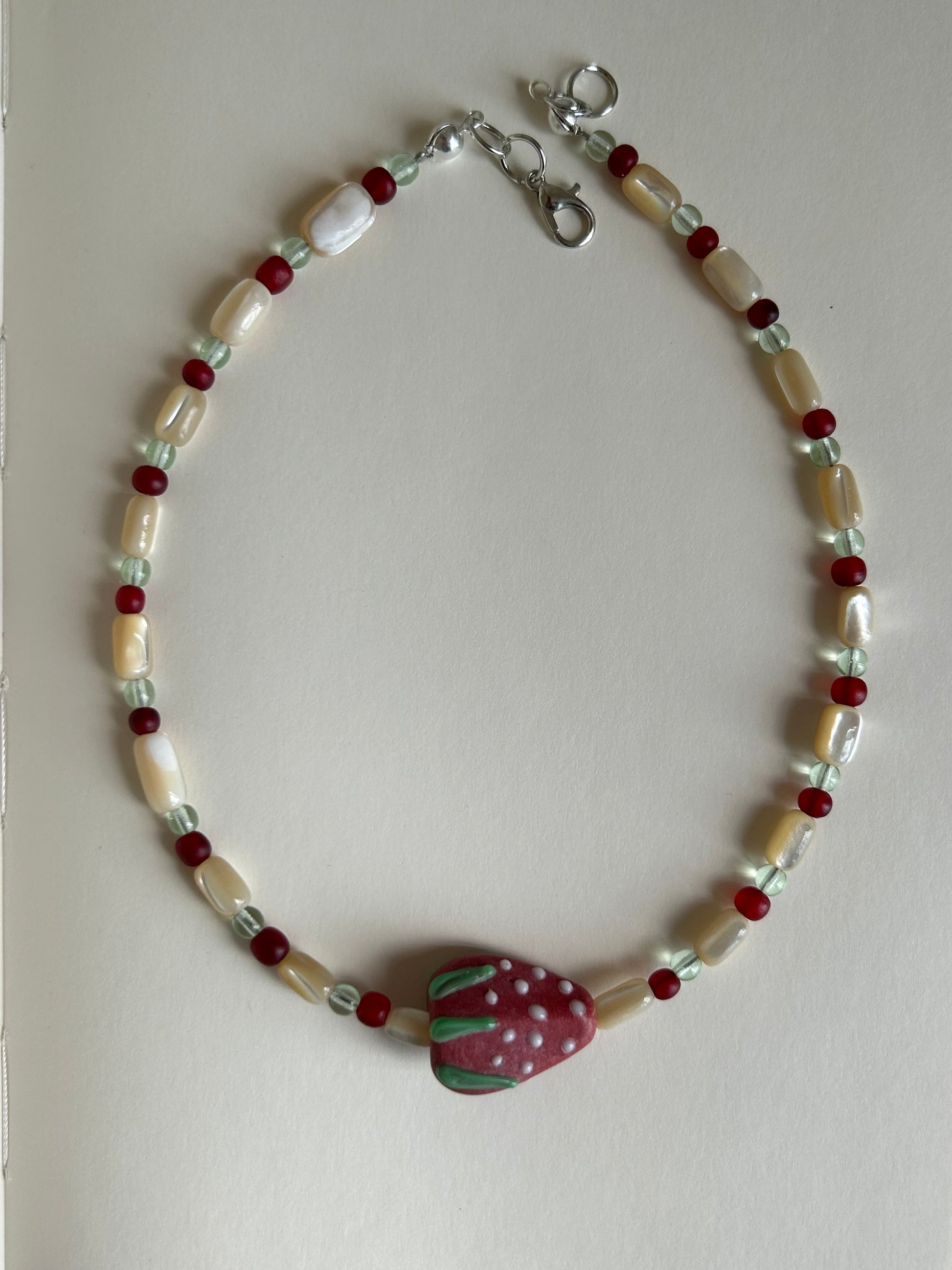 The soft-toned beads are made of natural shell, and the strawberry is crafted from polymer clay.