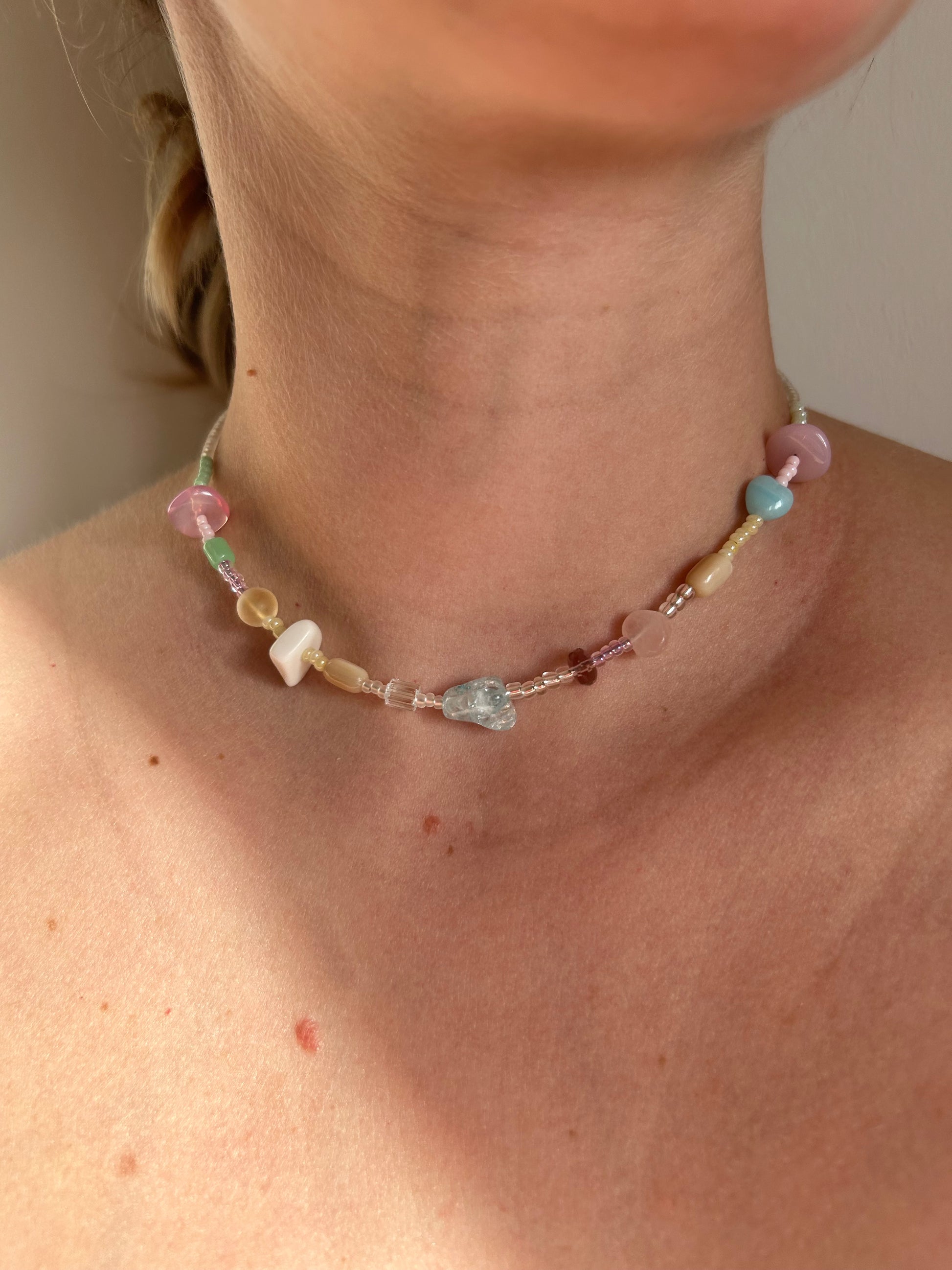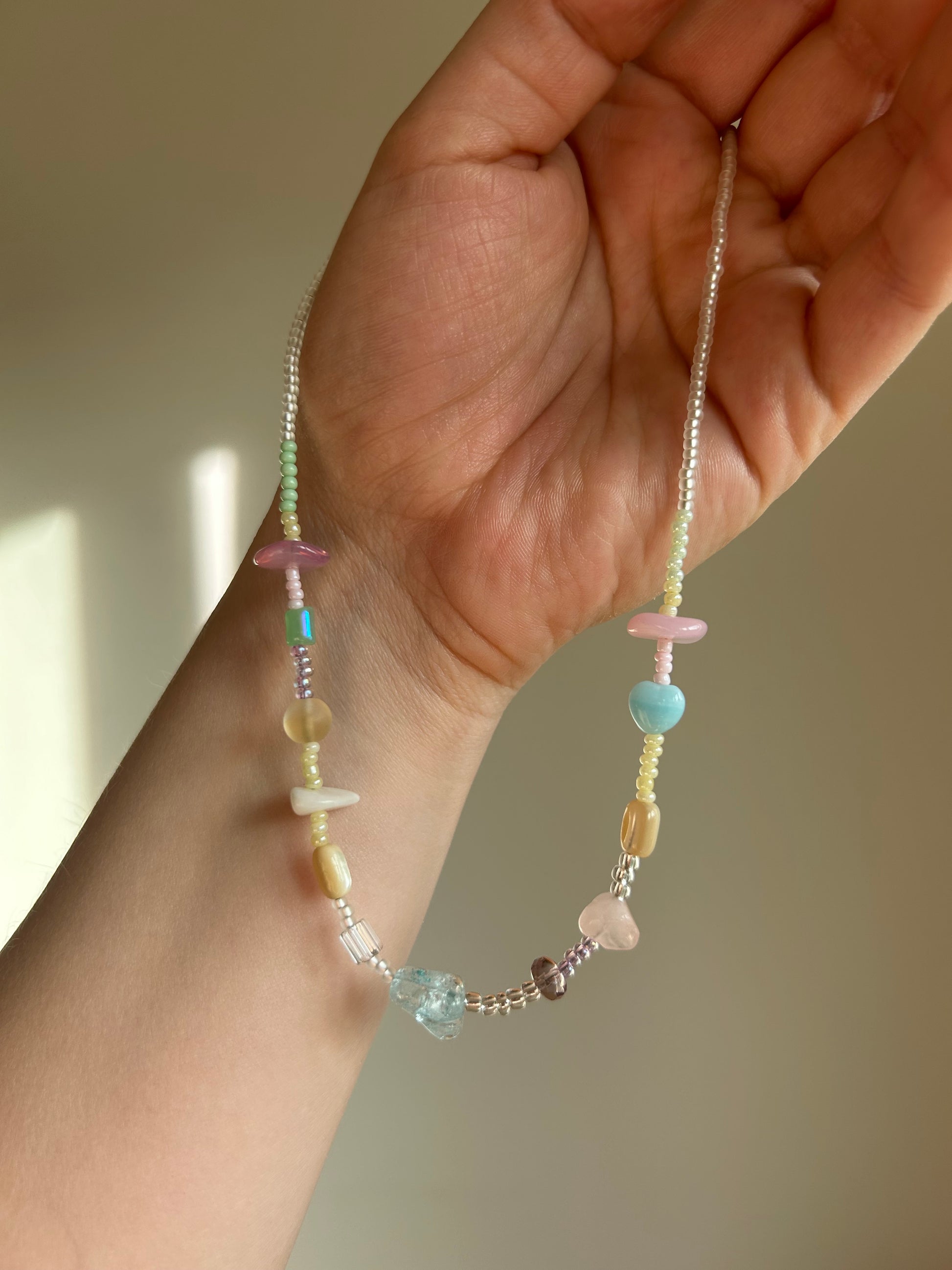 Delicate necklace combining a soft mix of pastel gemstones and high-quality Japanese glass beads. Strung on stainless steel wire with a lobster clasp. One of a kind.