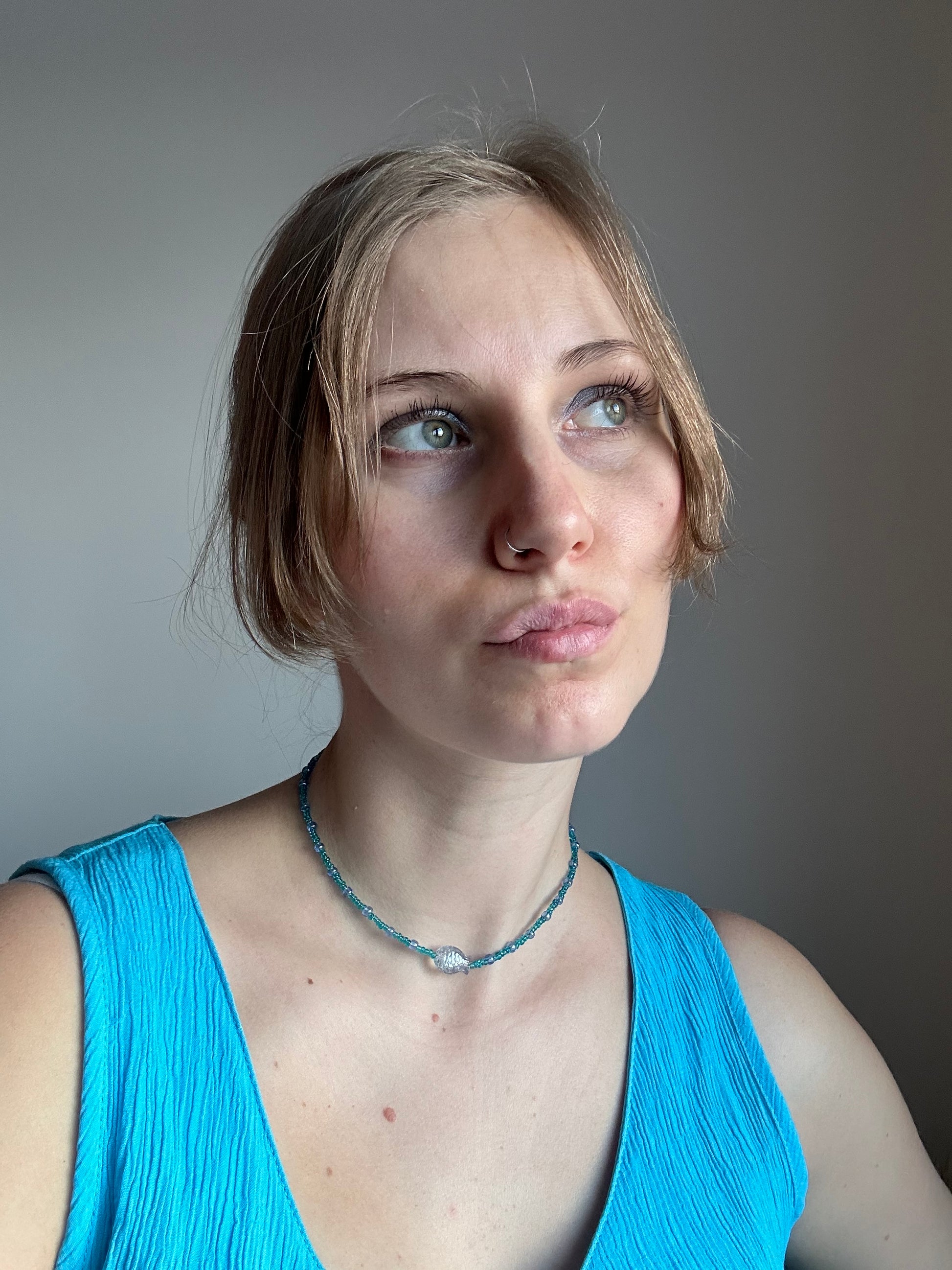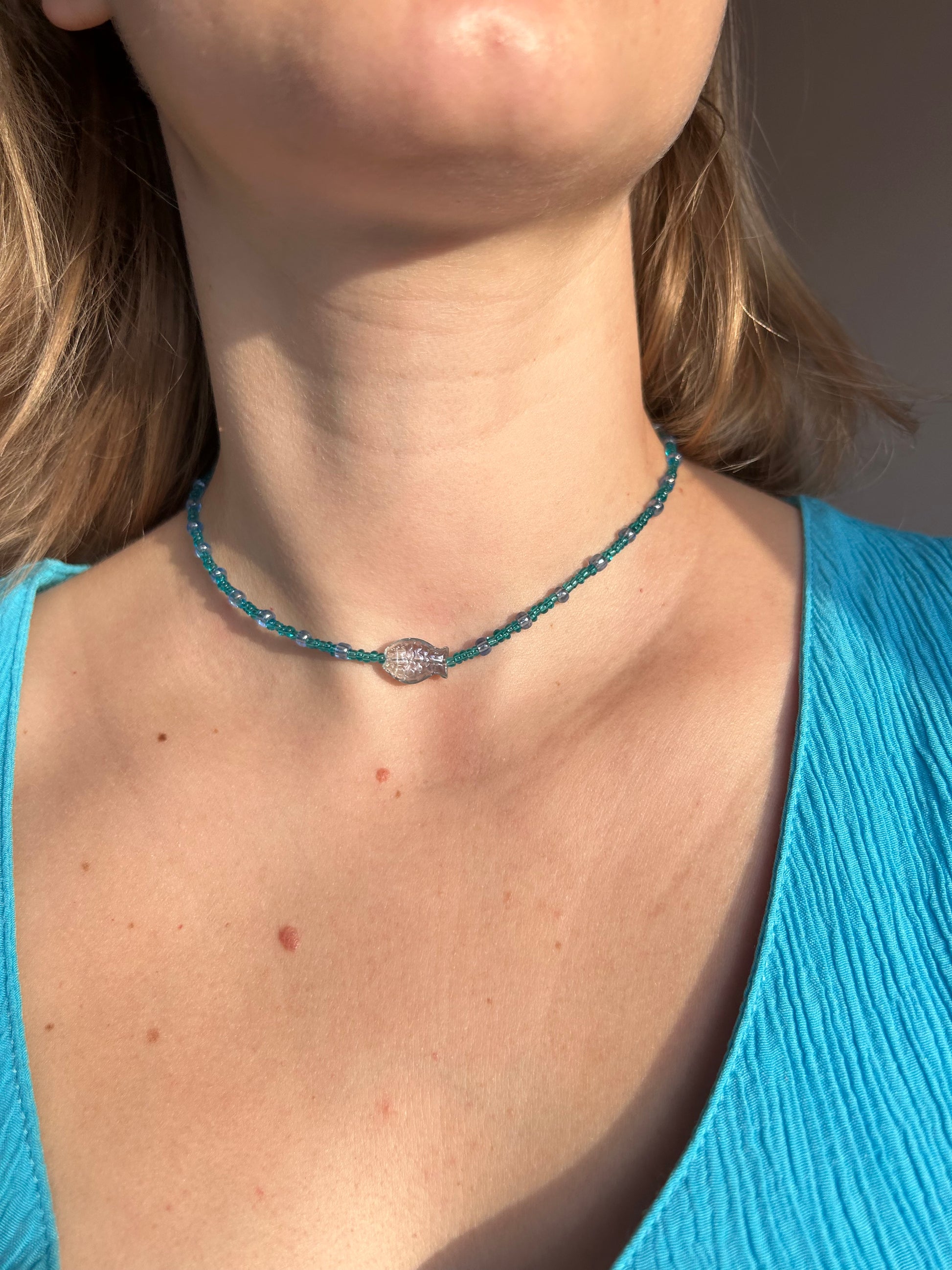 Handmade beaded necklace featuring a mix of colorful seed beads and a central silver fish-shaped pendant with an engraved design. The necklace measures 38 cm in length, strung on stainless steel wire with a secure clasp. A playful and lightweight piece with a unique marine-inspired touch.