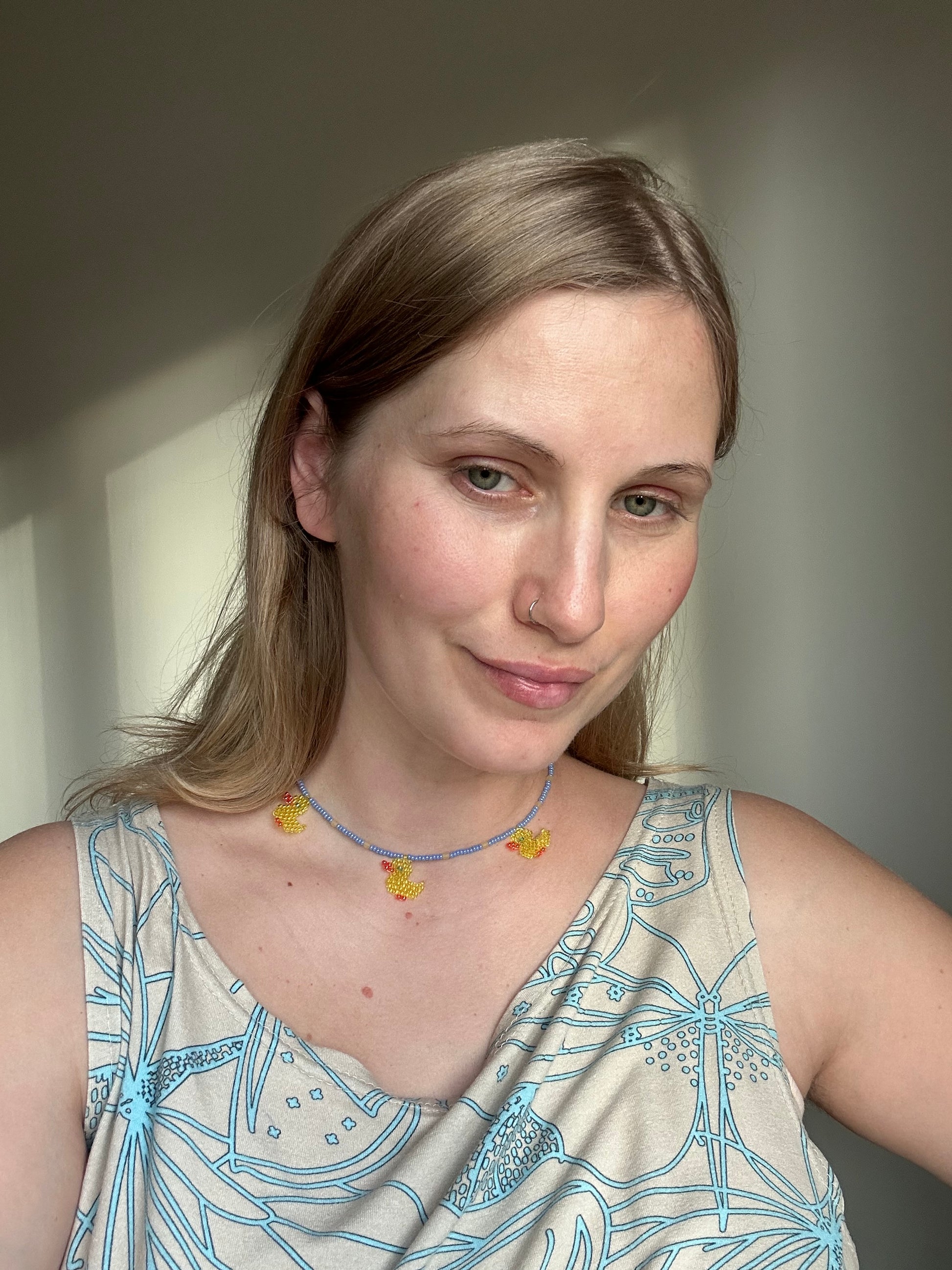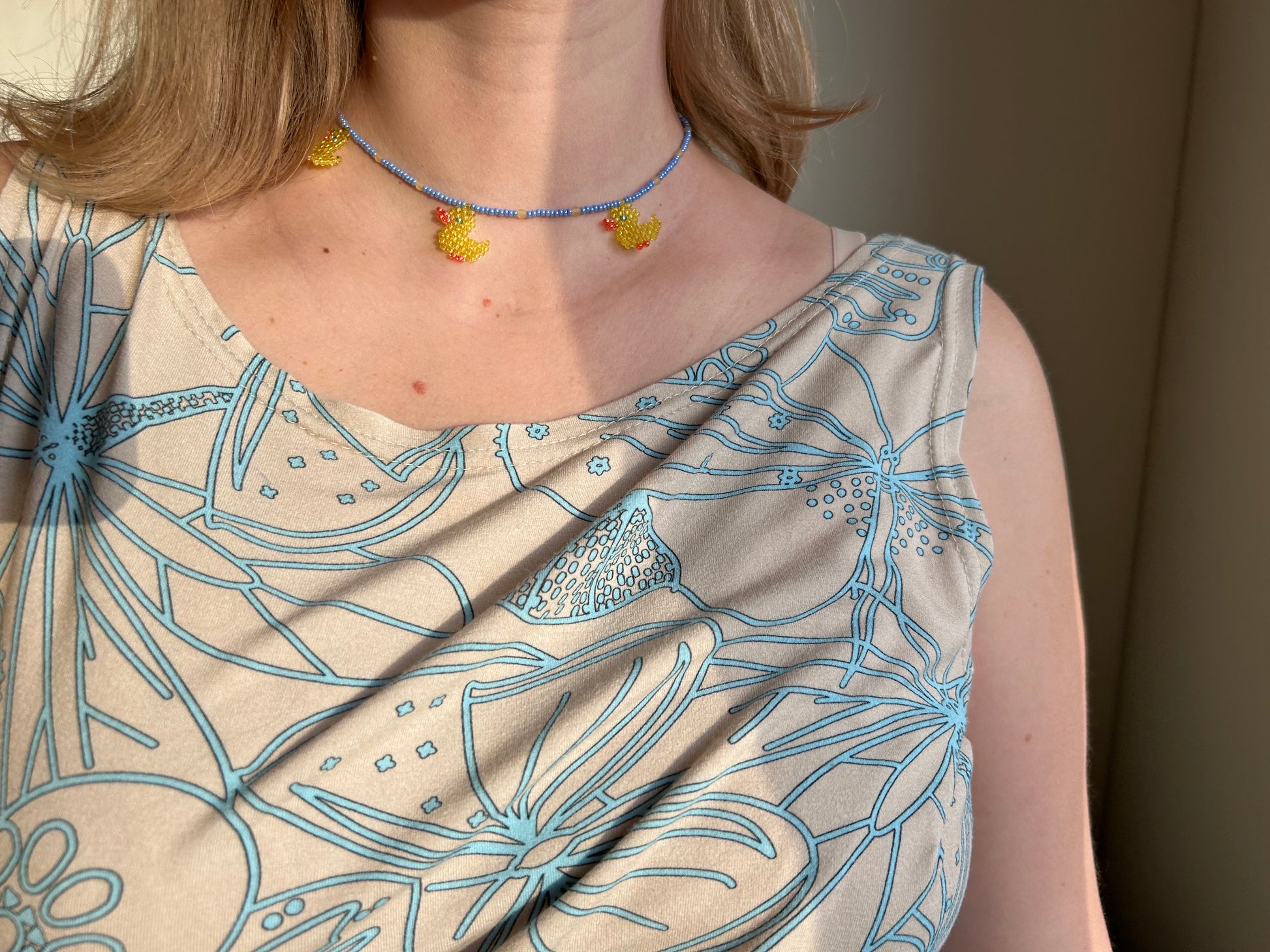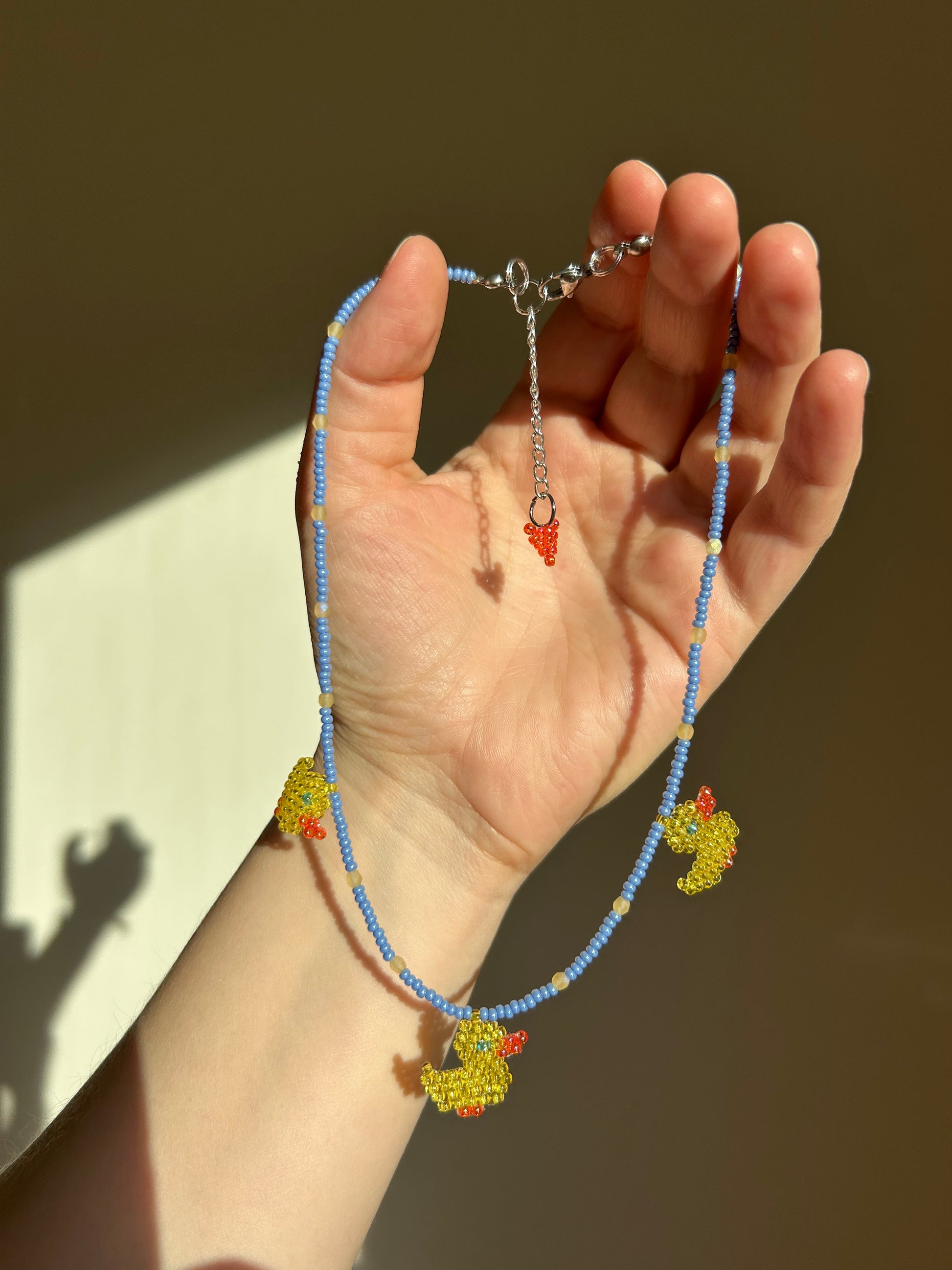 Three tiny ducks swimming on a sea of blue glass beads. Handmade with care, stainless steel clasp included for sturdy fun.