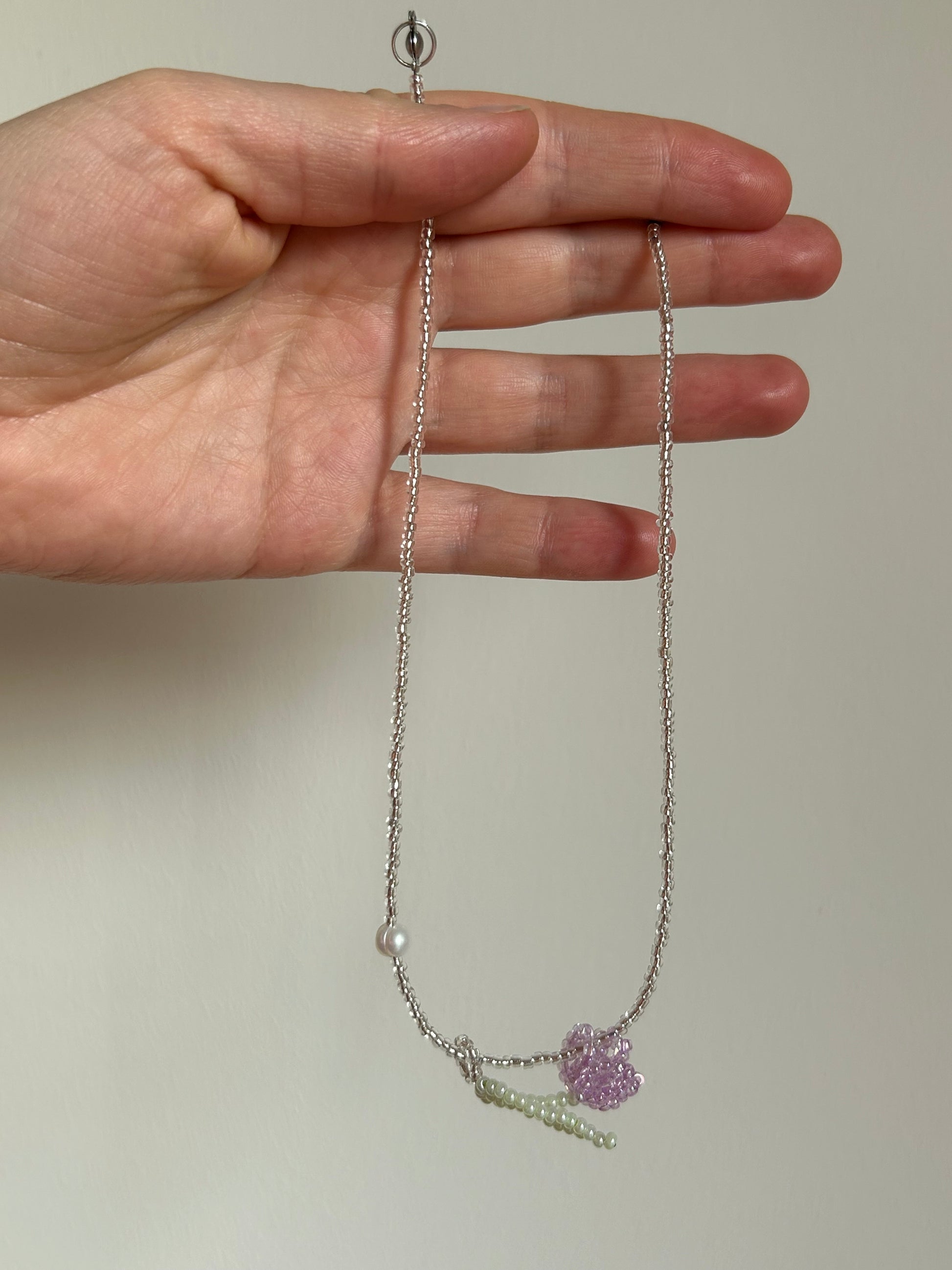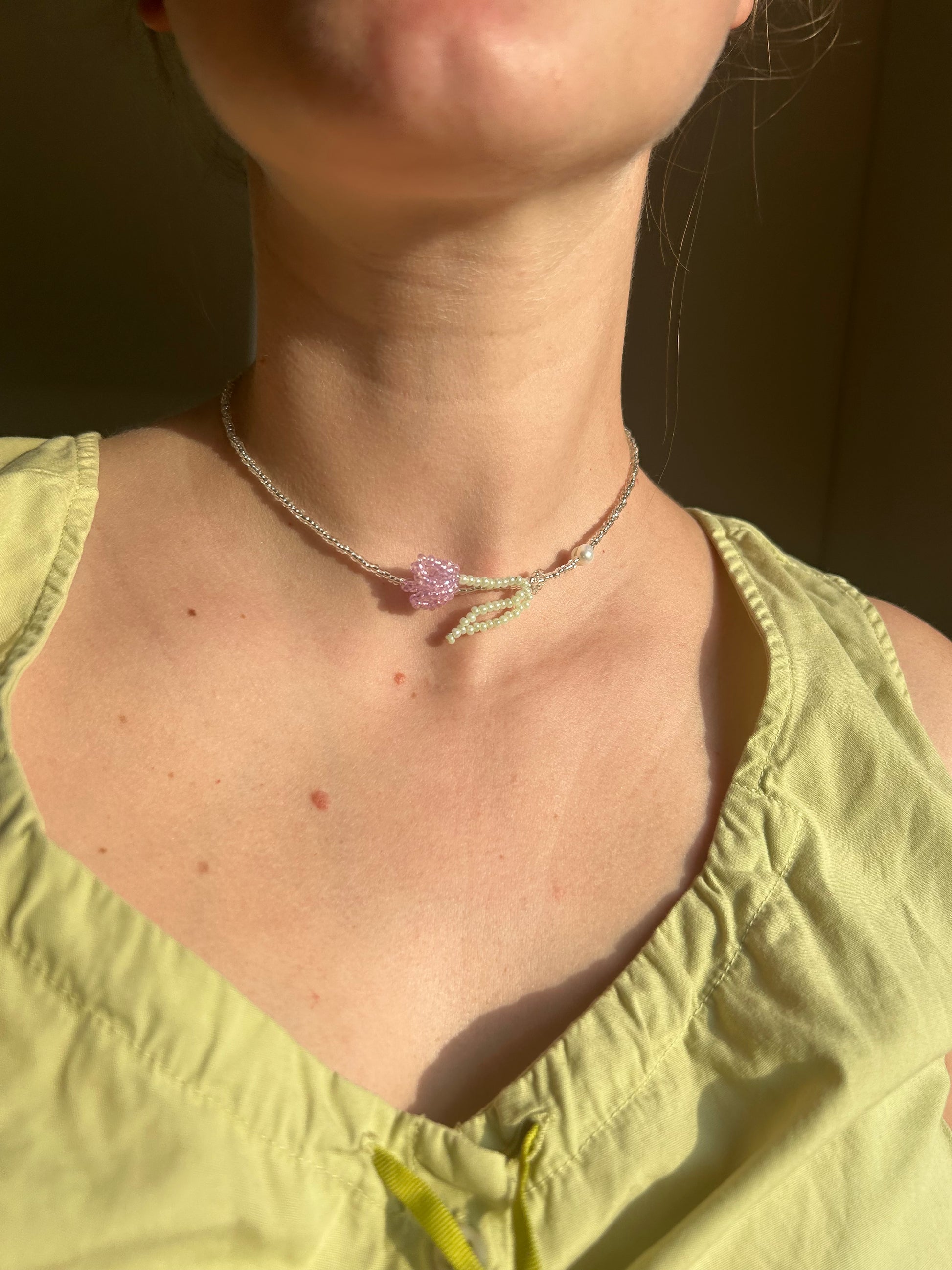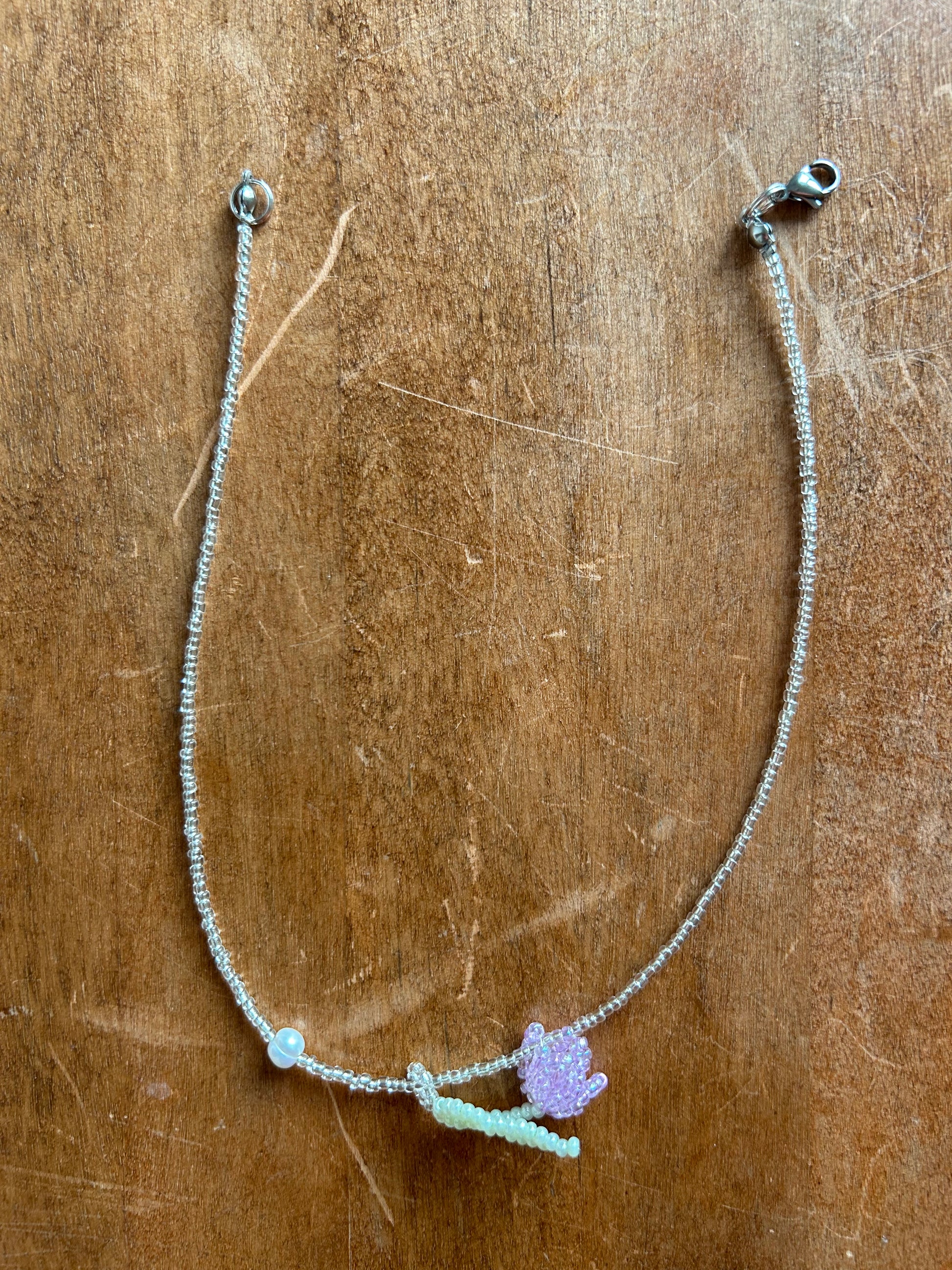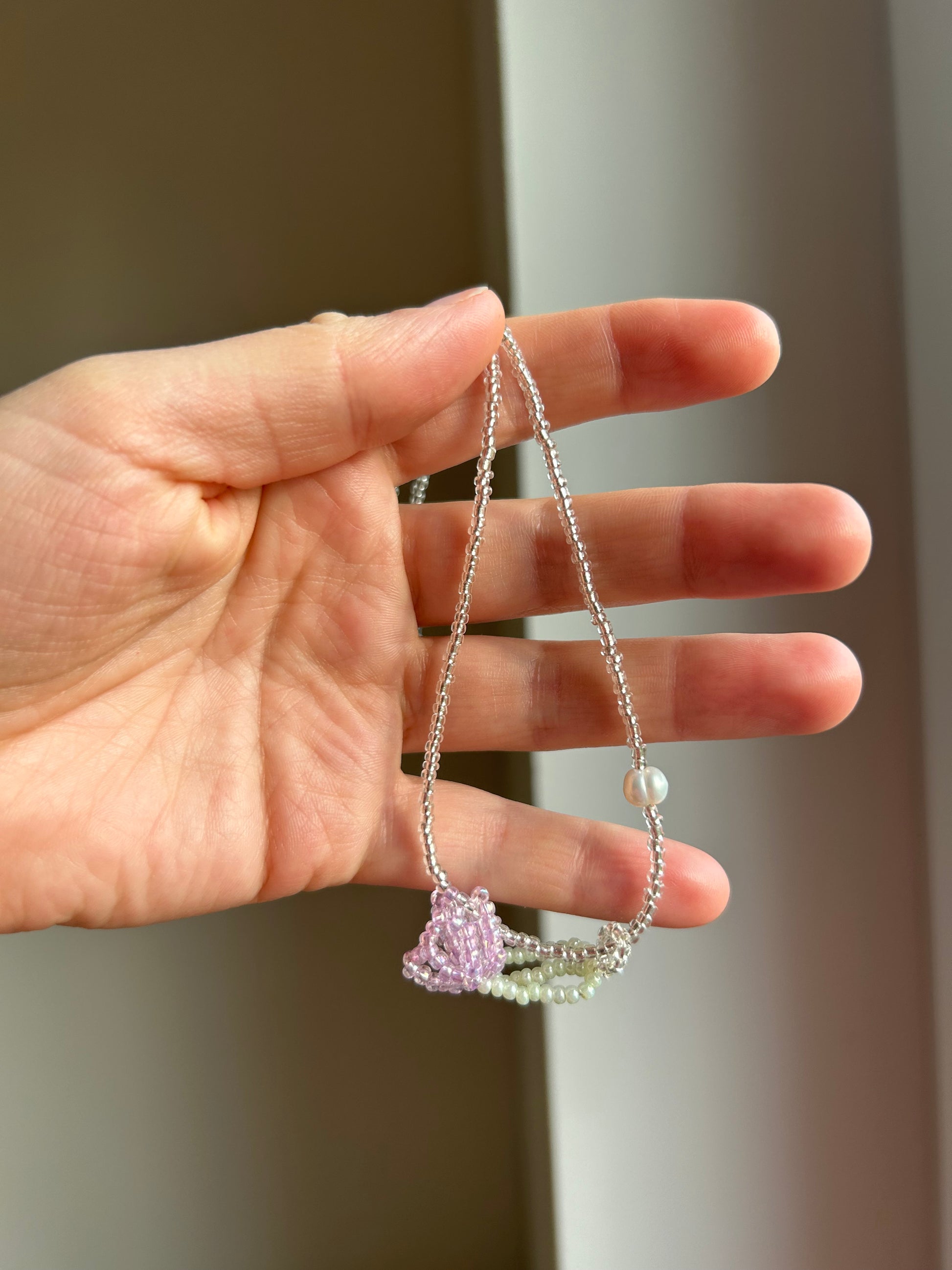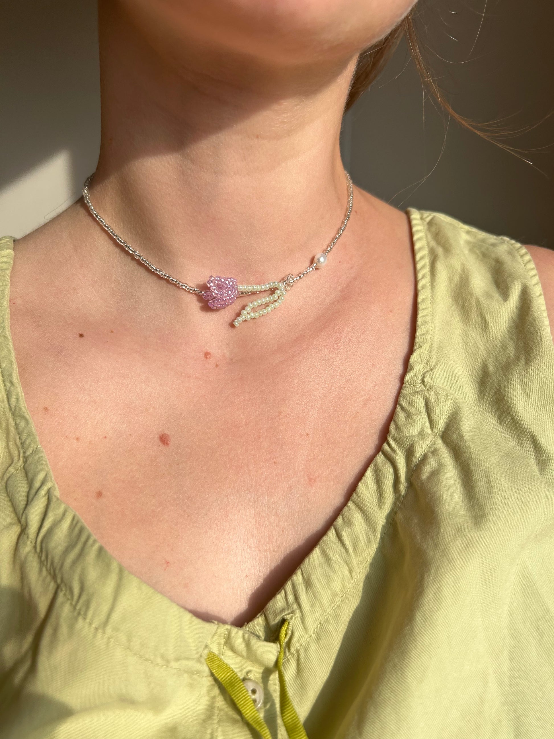 Delicate tulip necklace — a little spring for everyday. Clear glass beads, a tulip in soft purple and green tones, and a small pearl detail.