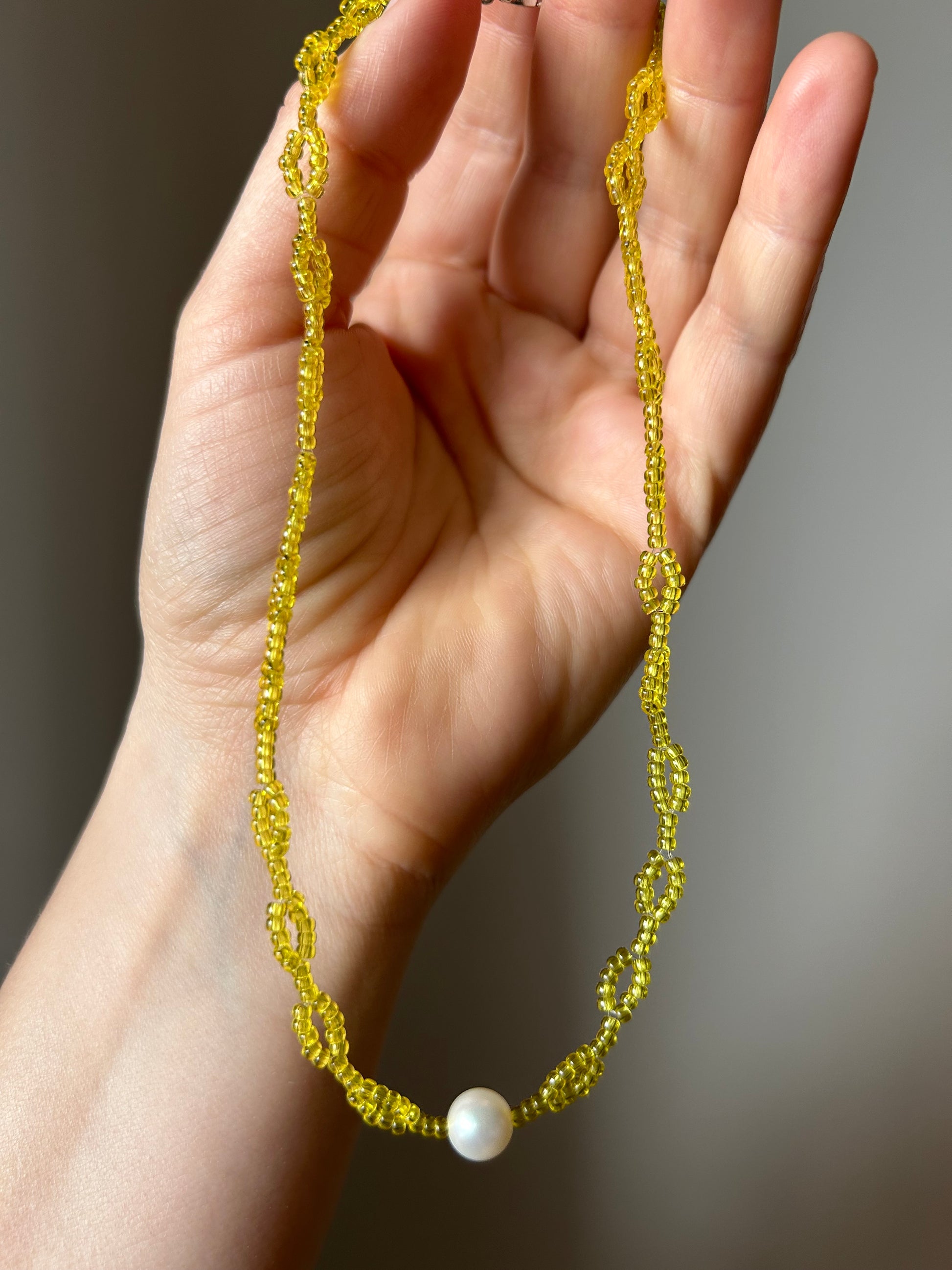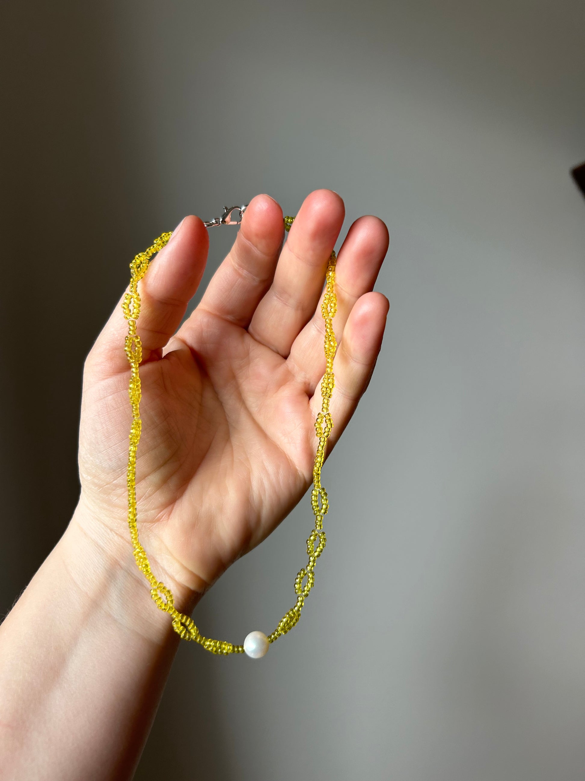 A bold and cheerful handmade choker, one of a kind. Woven in a lively yellow hue with a single freshwater pearl at the center—like a tiny drop of sunlight resting on your skin. A perfect piece to brighten up any outfit. Length: 36 cm.