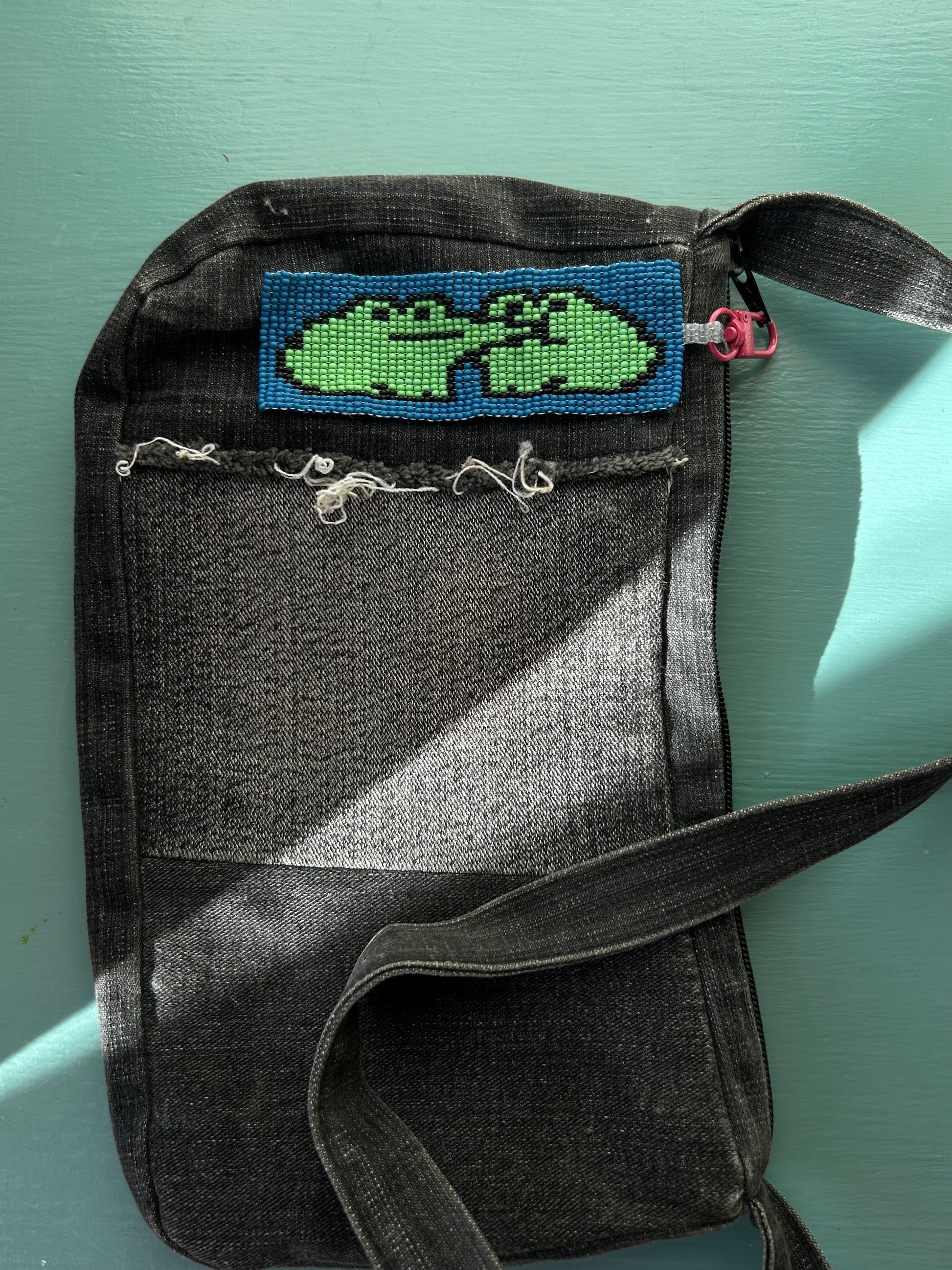 Beaded pendant featuring two kissing frogs in bright green on a deep blue background.