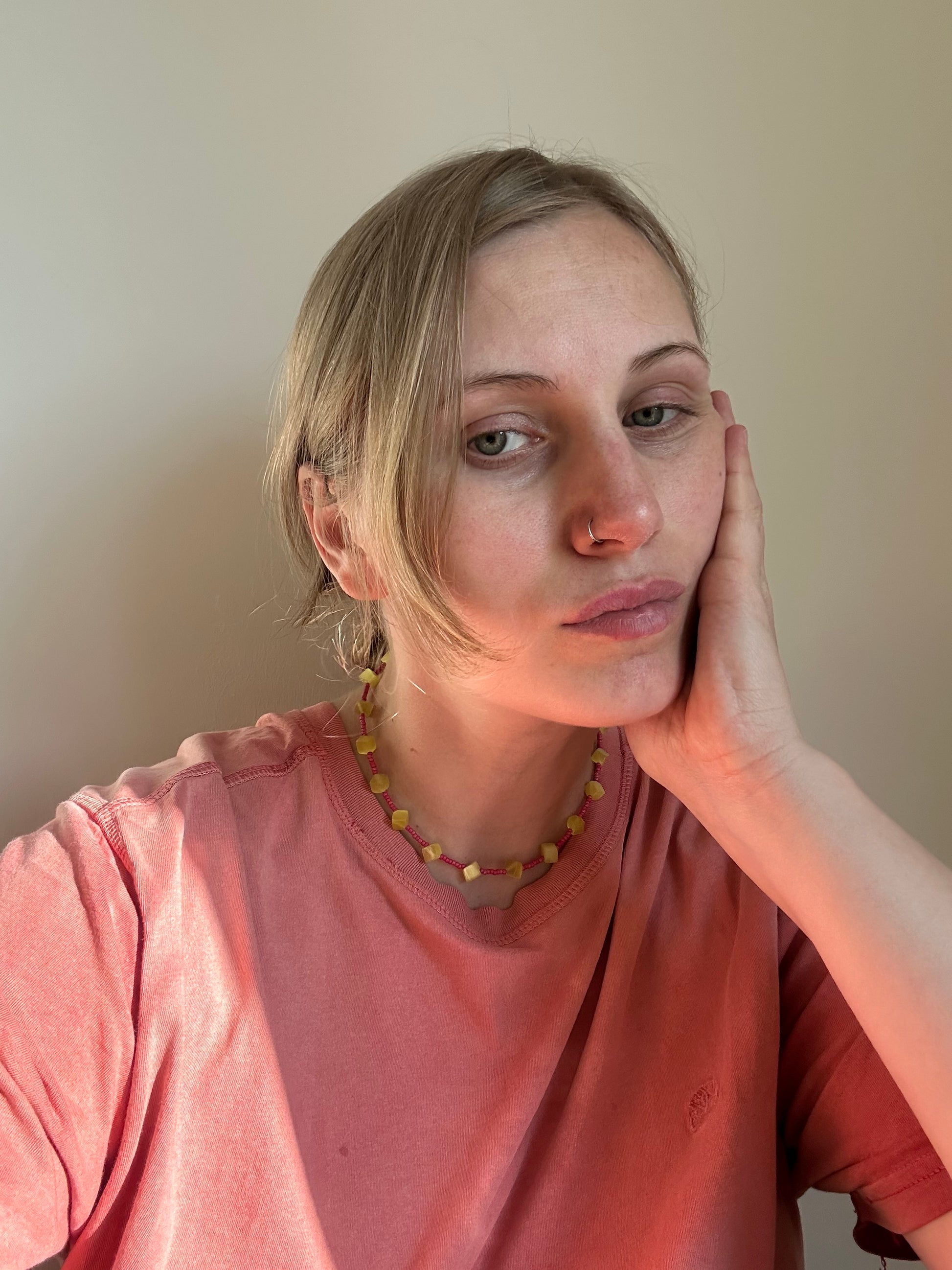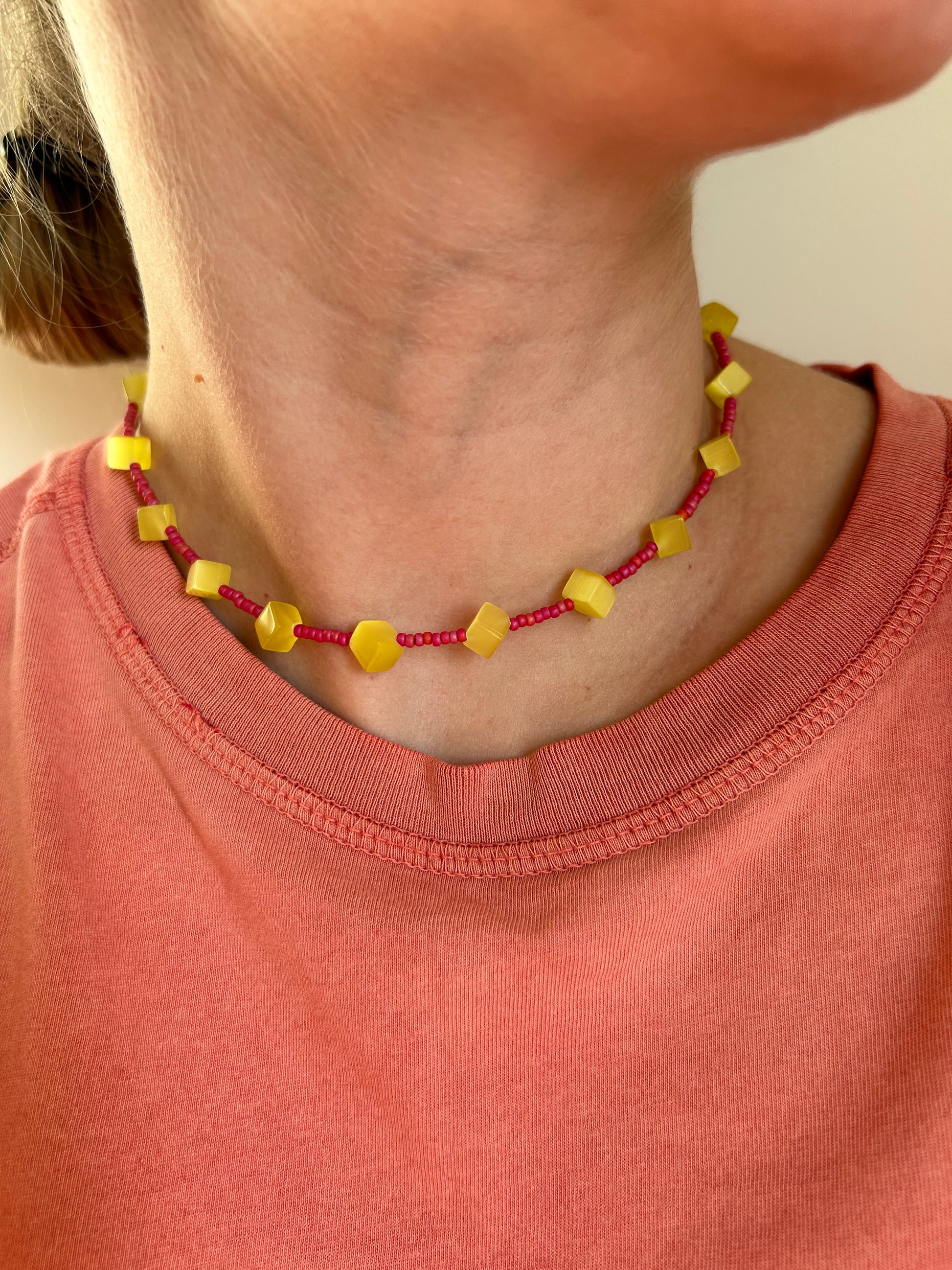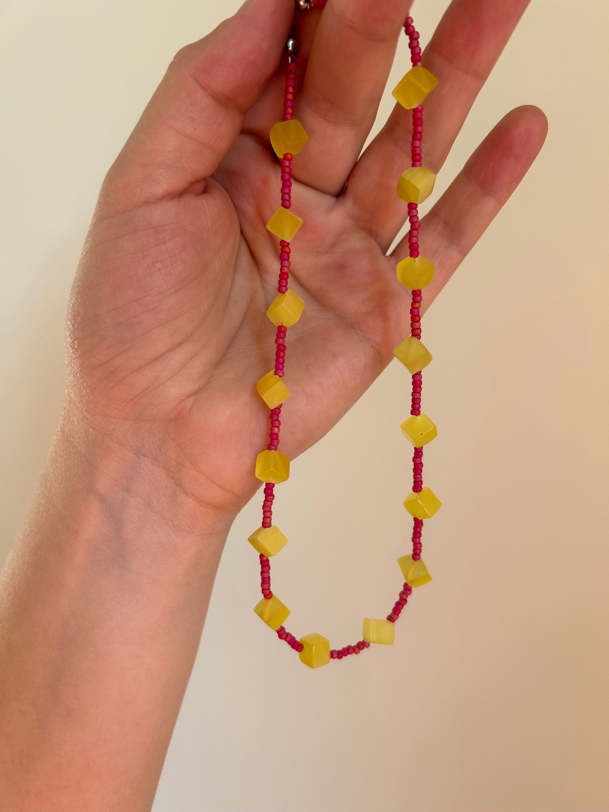 A fun, candy-colored necklace made from bright yellow cube beads and juicy pink seed beads.