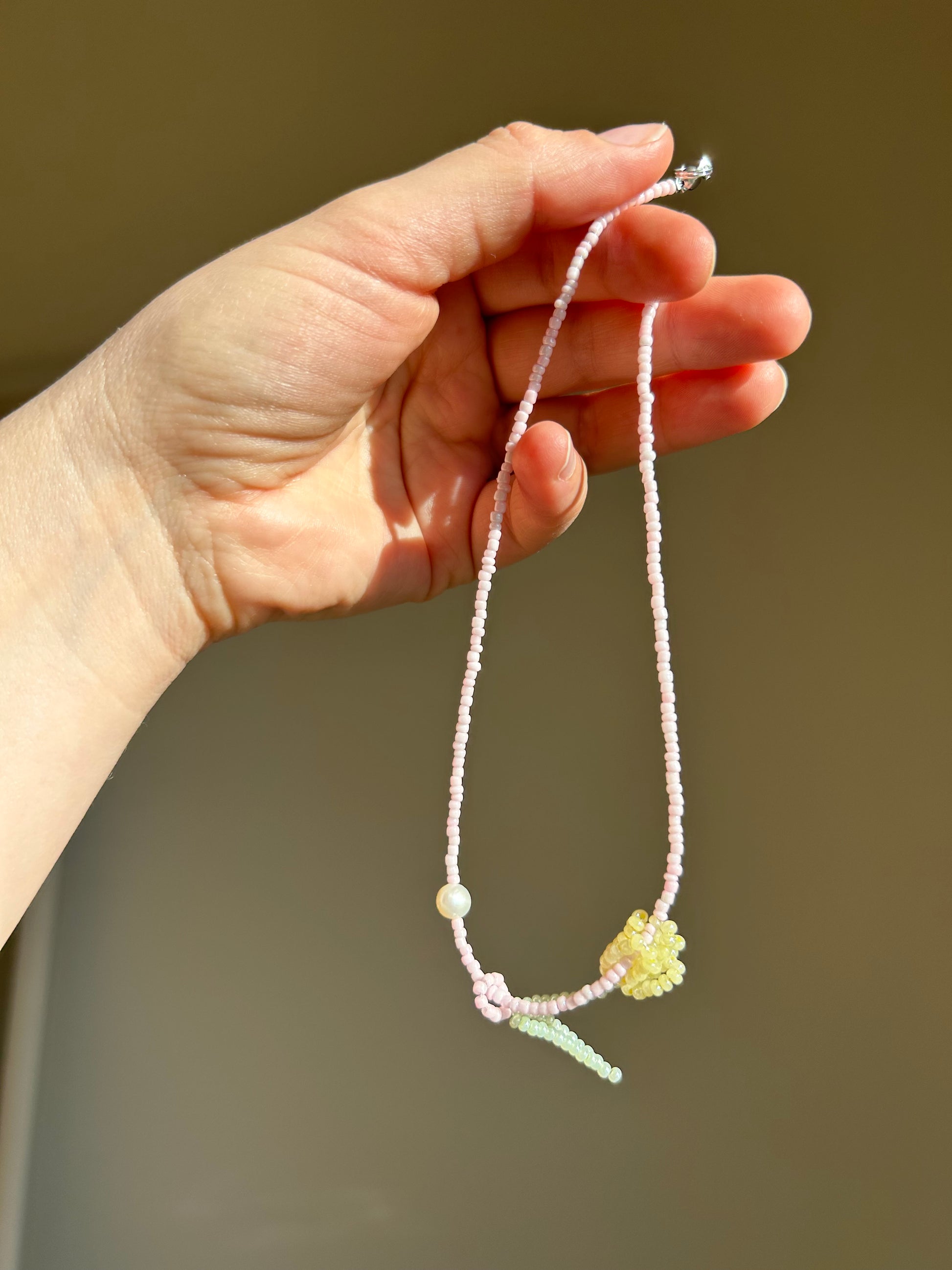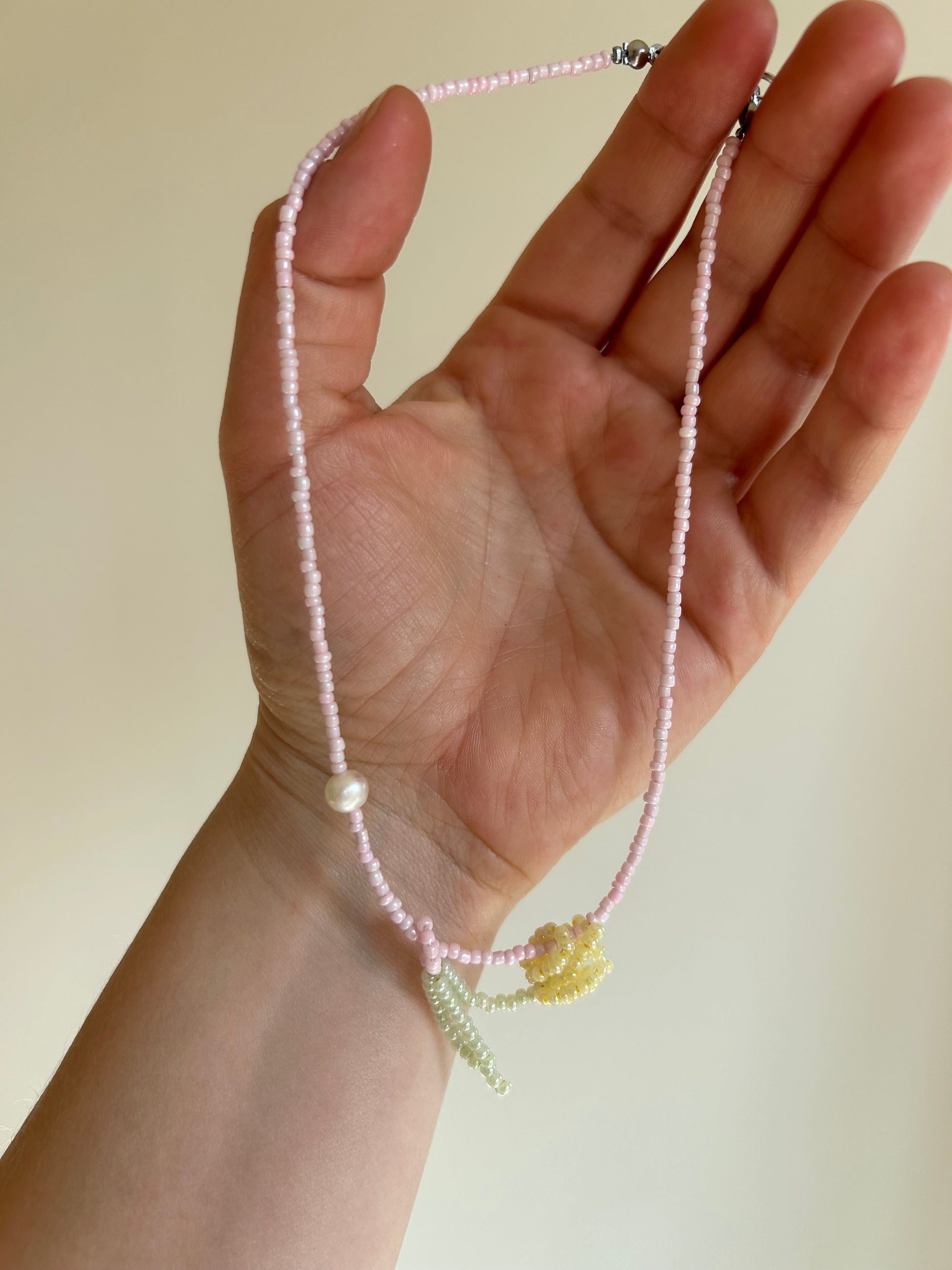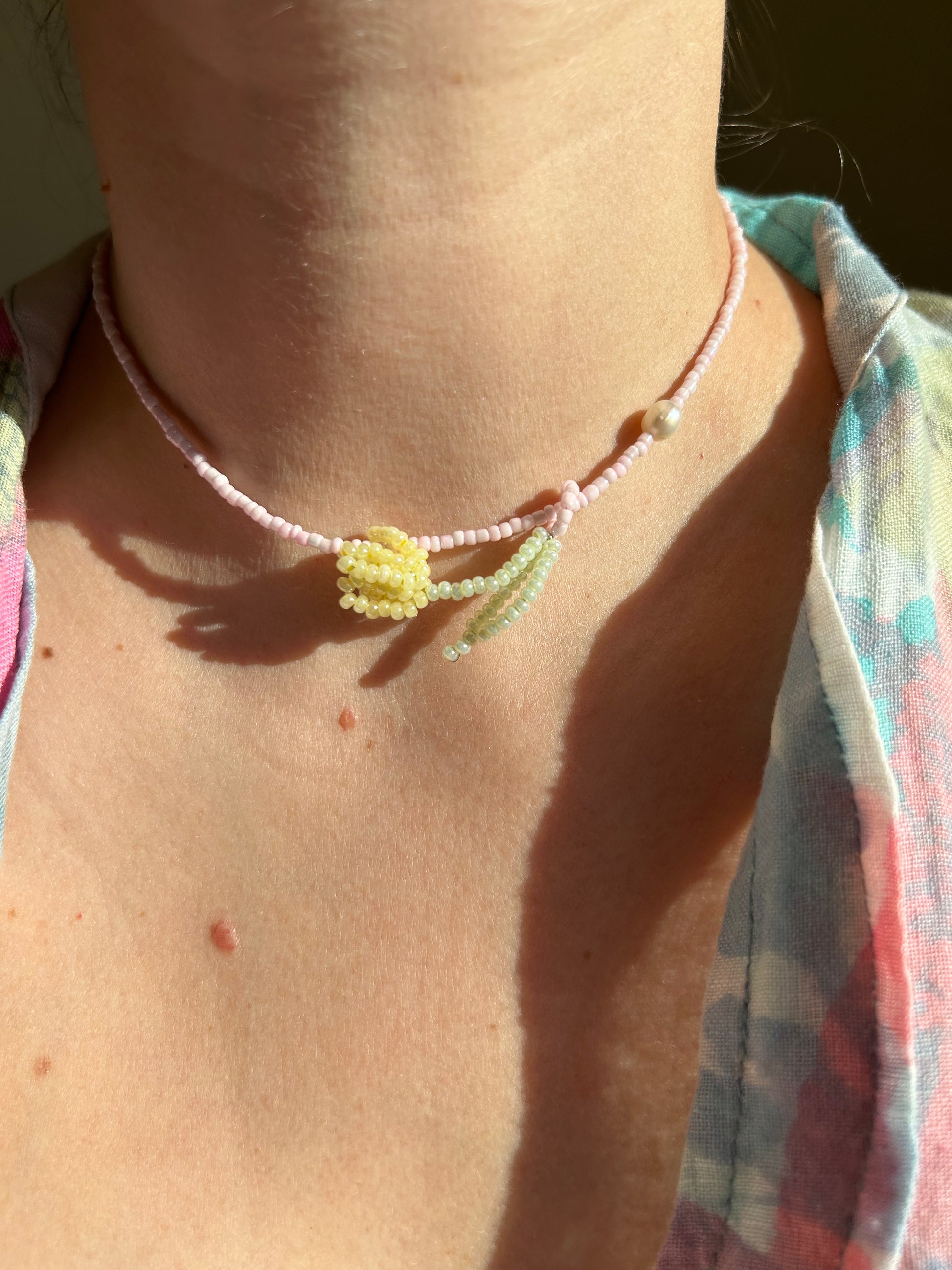 Soft pink beads, a delicate yellow tulip, and a light green stem — like a scoop of lemon sorbet on a spring afternoon.