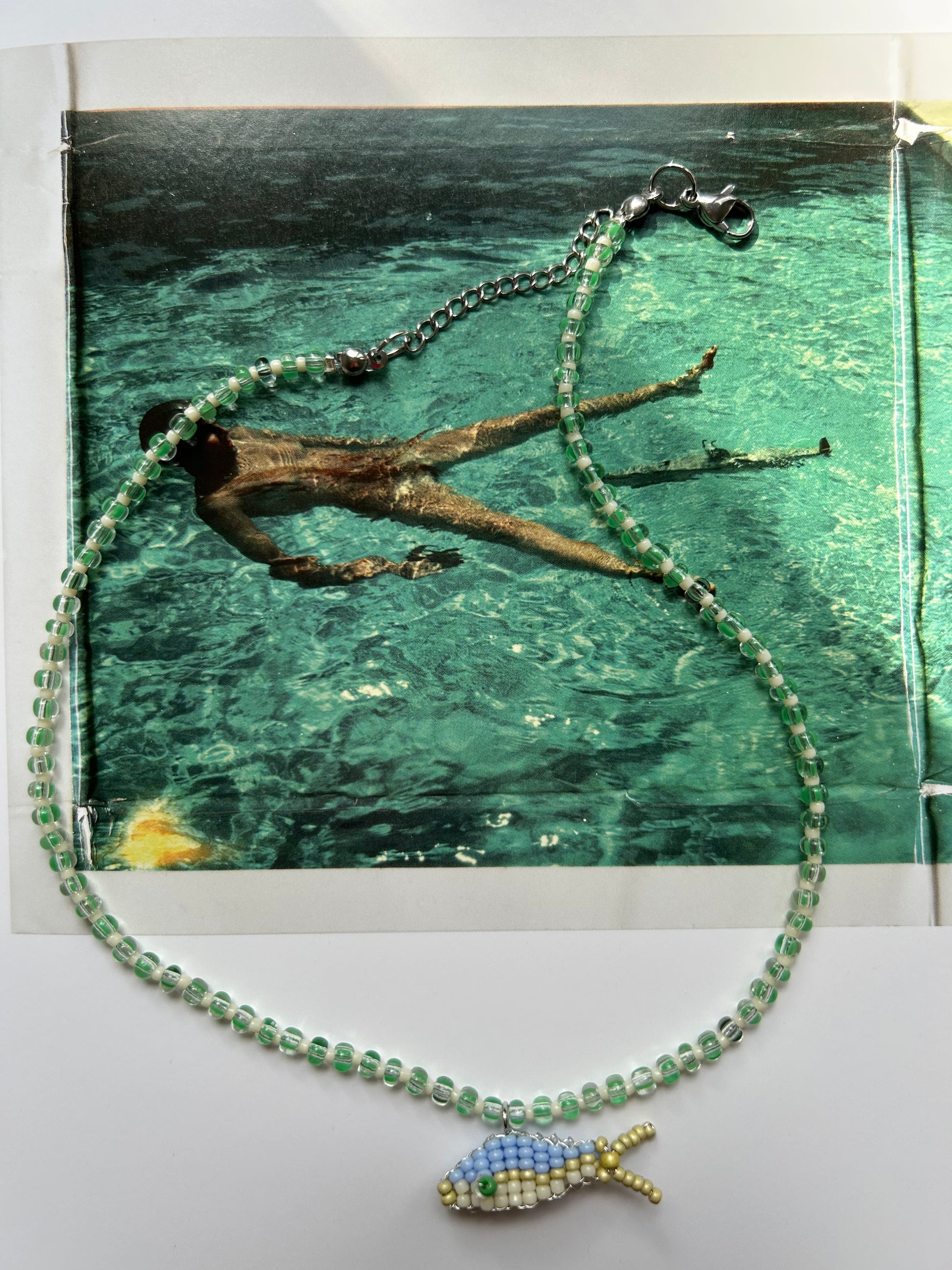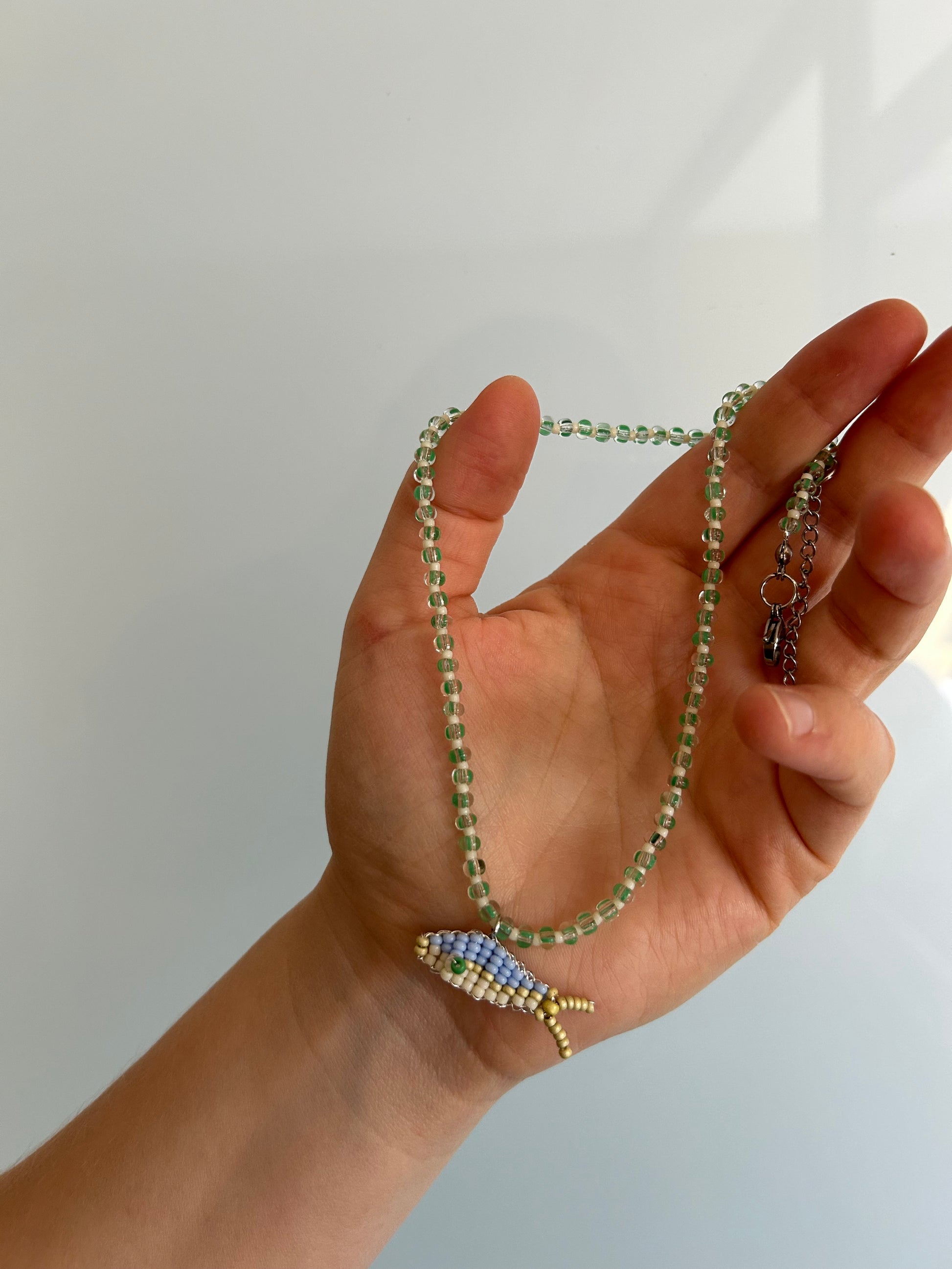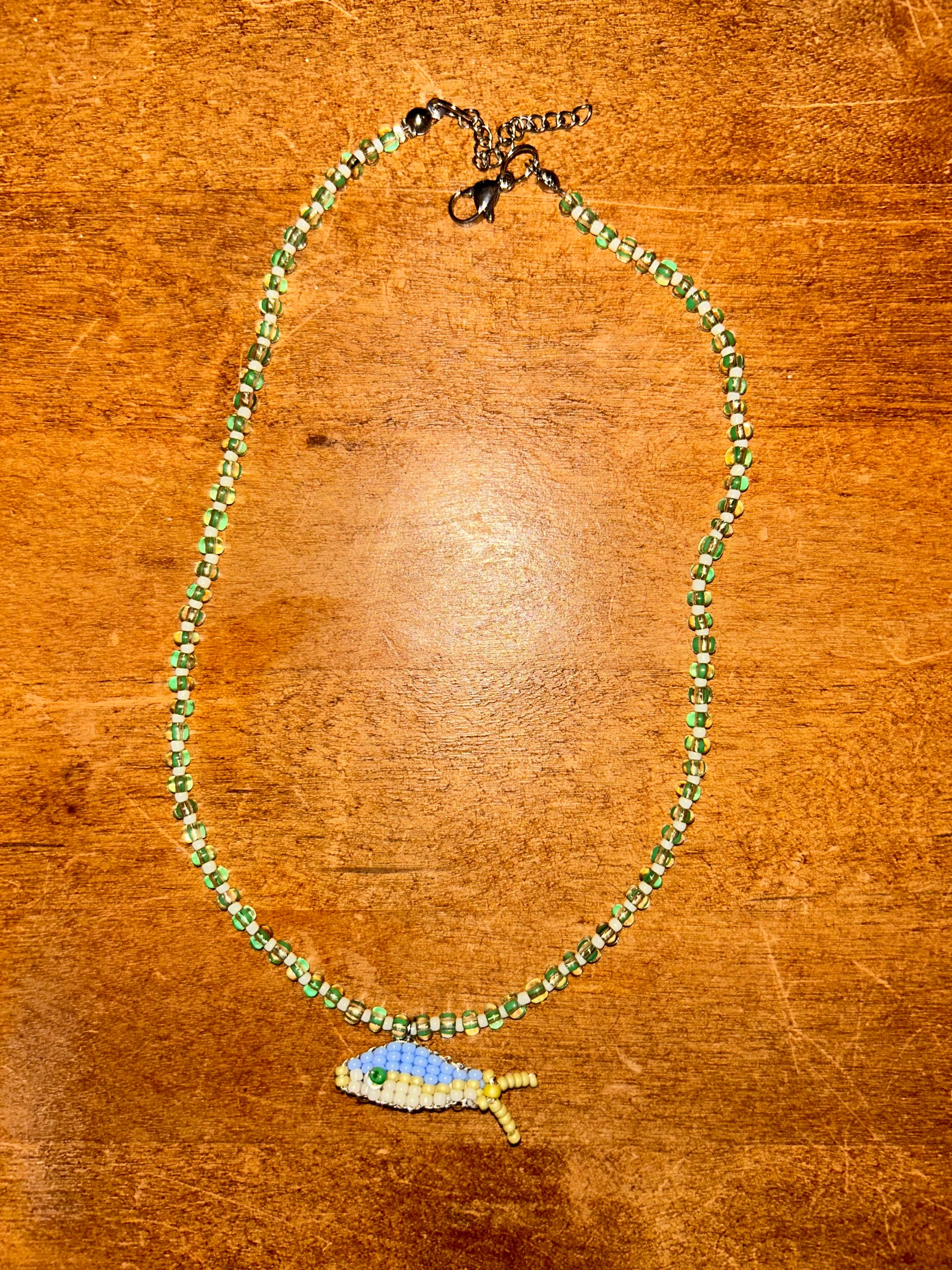 A whimsical necklace with a handmade fish pendant, carefully crafted from colorful seed beads. The beads are strung on a strong stainless-steel wire for durability and comfort. Perfect for sea lovers, daydreamers, or anyone who wants to add a splash of fun to their outfit.