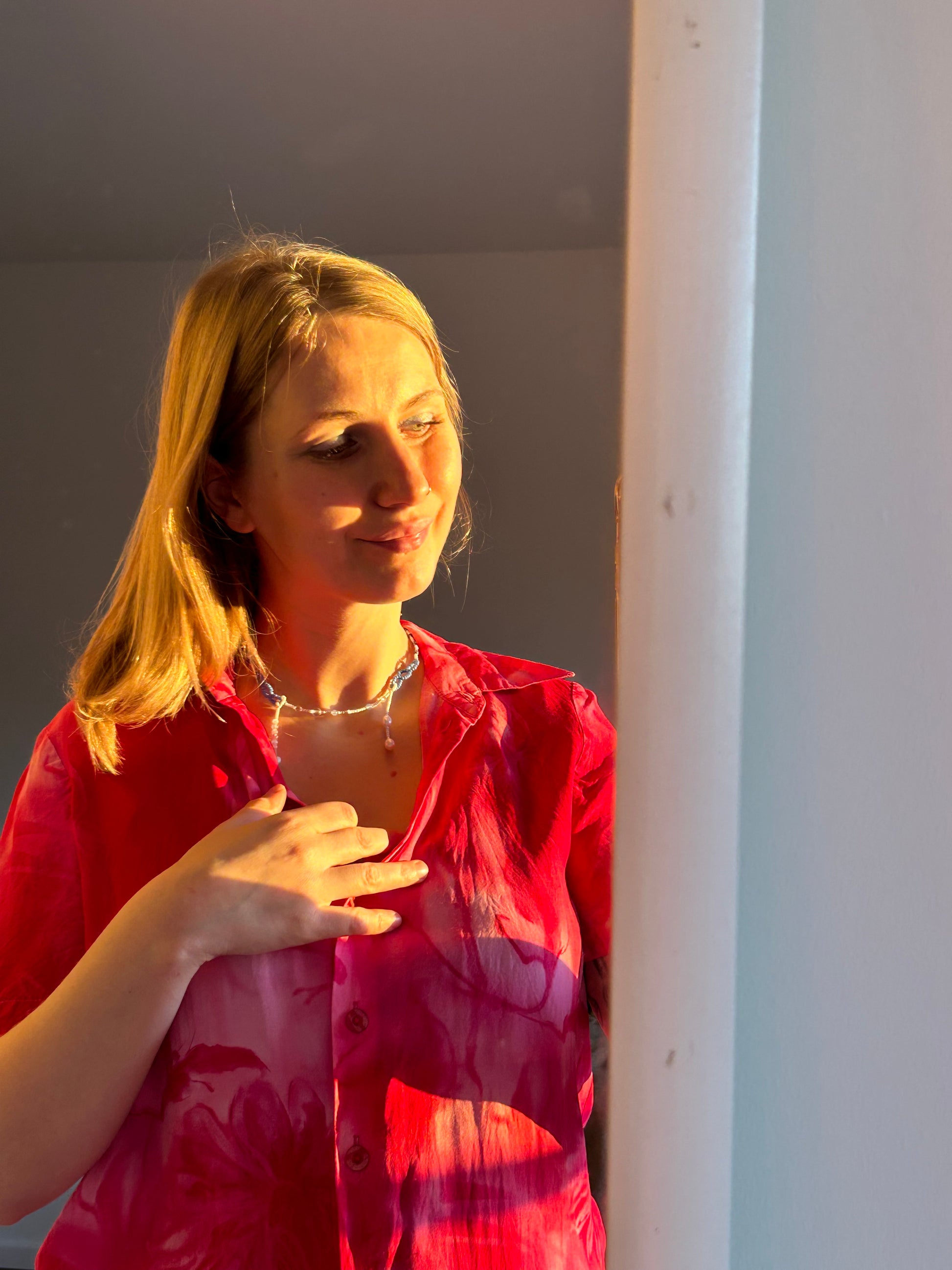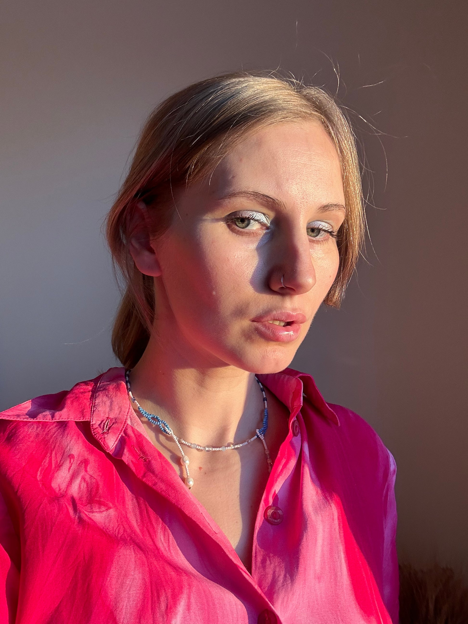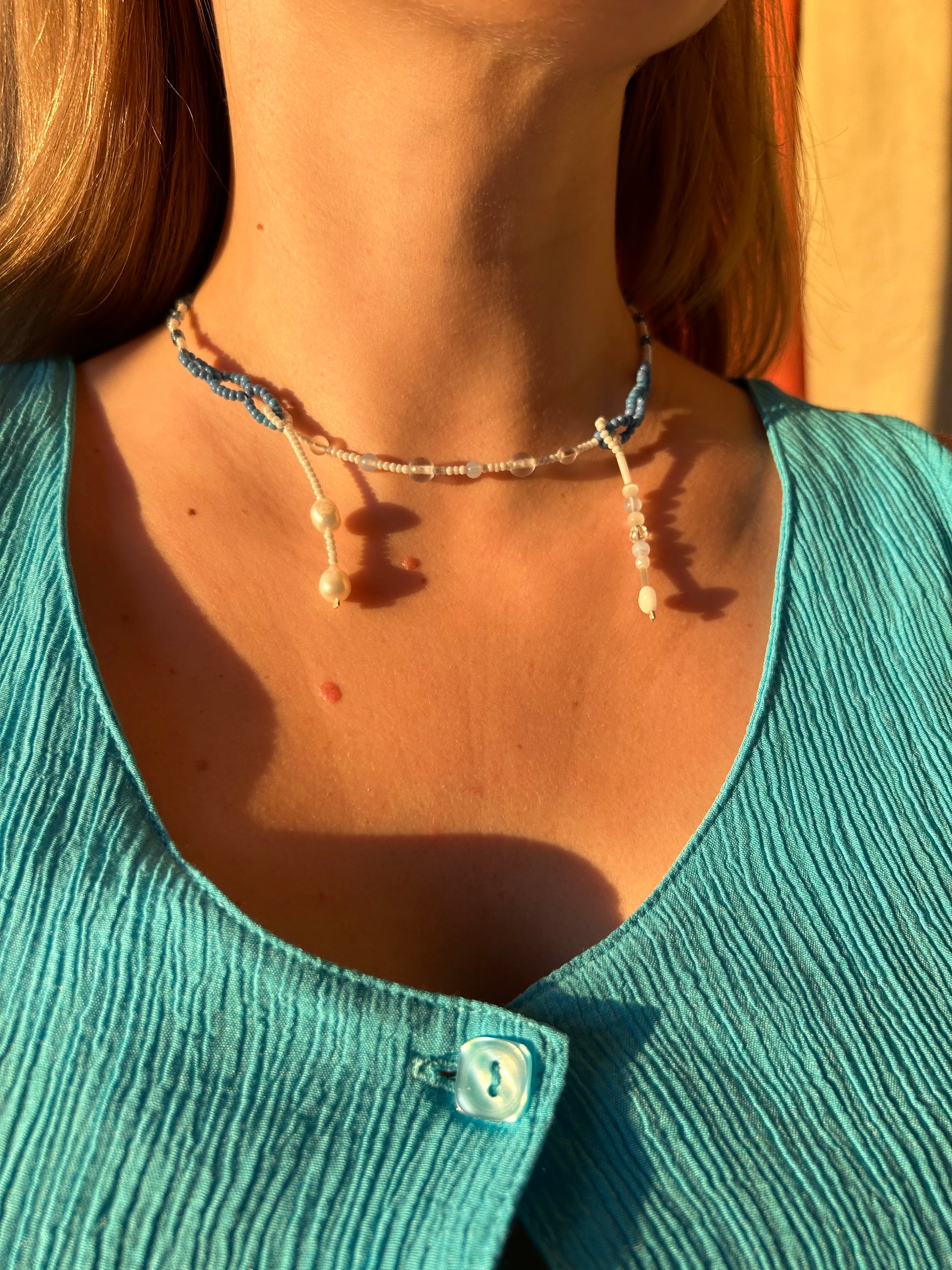 Handmade beaded necklace featuring a mix of white and blue seed beads, natural stones, and freshwater pearls. The asymmetrical design includes delicate dangling elements that add movement and elegance. The necklace measures 38 cm in length, strung on durable stainless steel wire with a secure clasp.