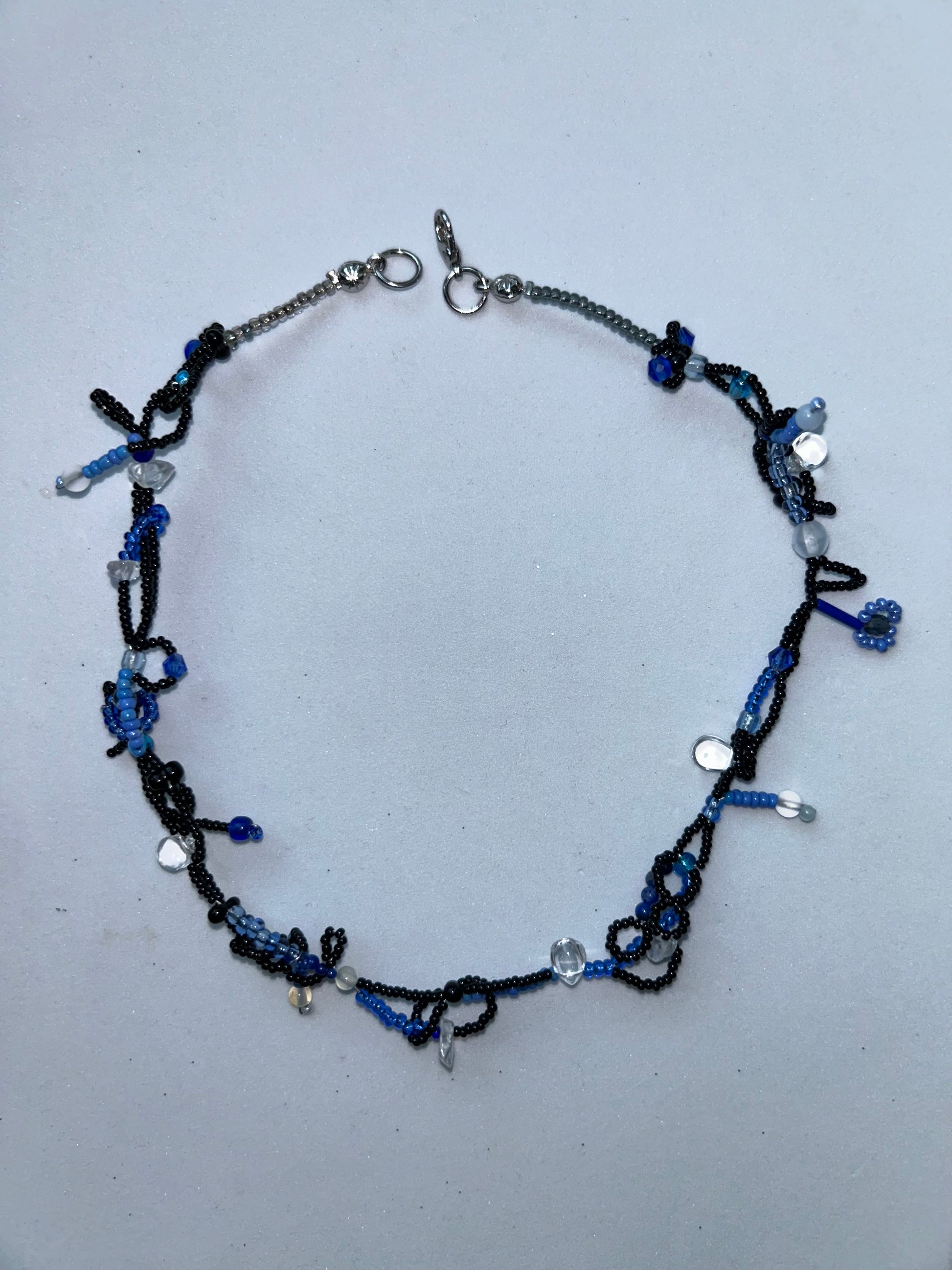 Handmade beaded necklace, featuring an intricate design in black and blue tones with clear accents. This one-of-a-kind piece measures 38 cm in length, offering a unique and delicate accessory for any outfit