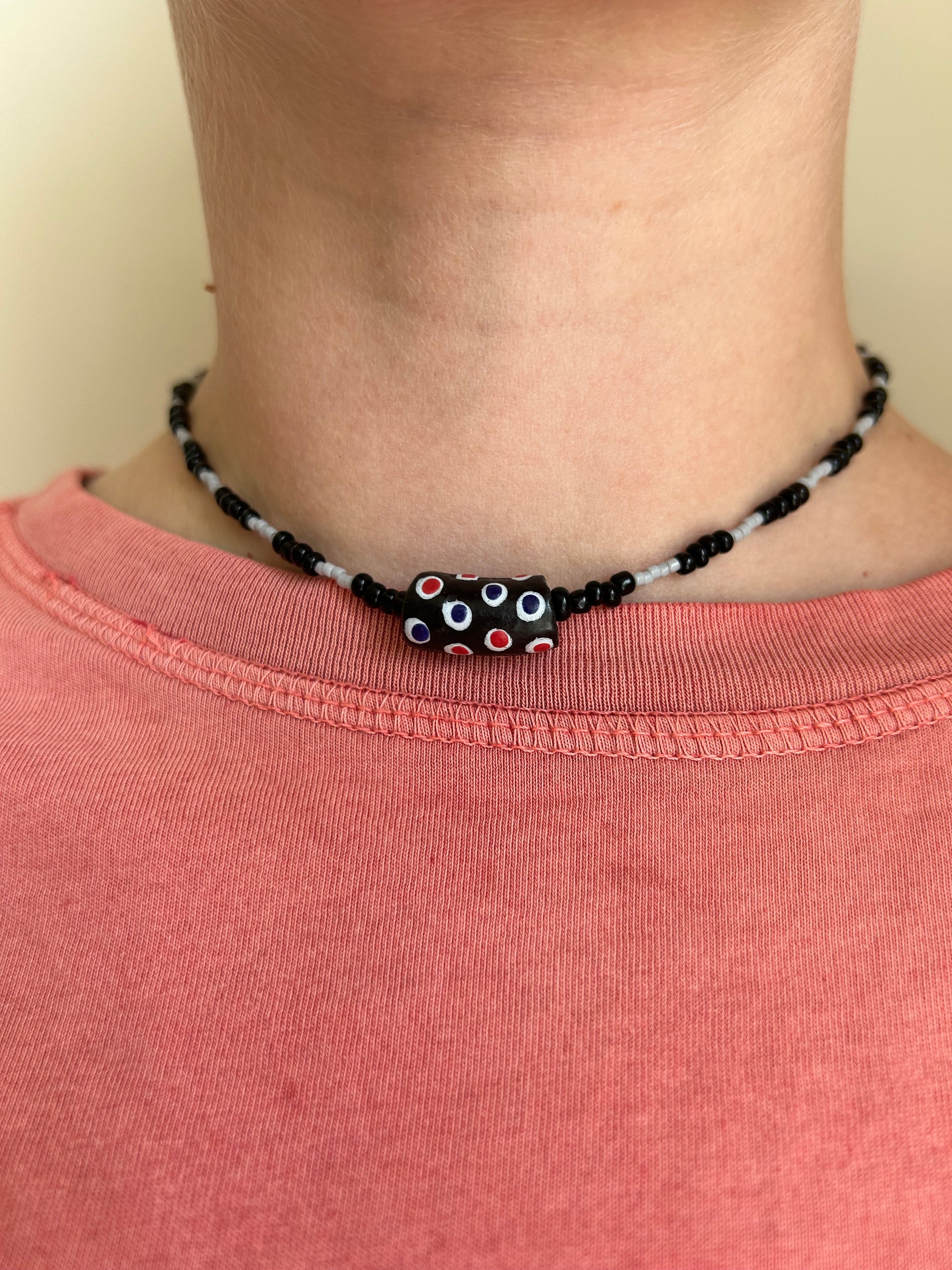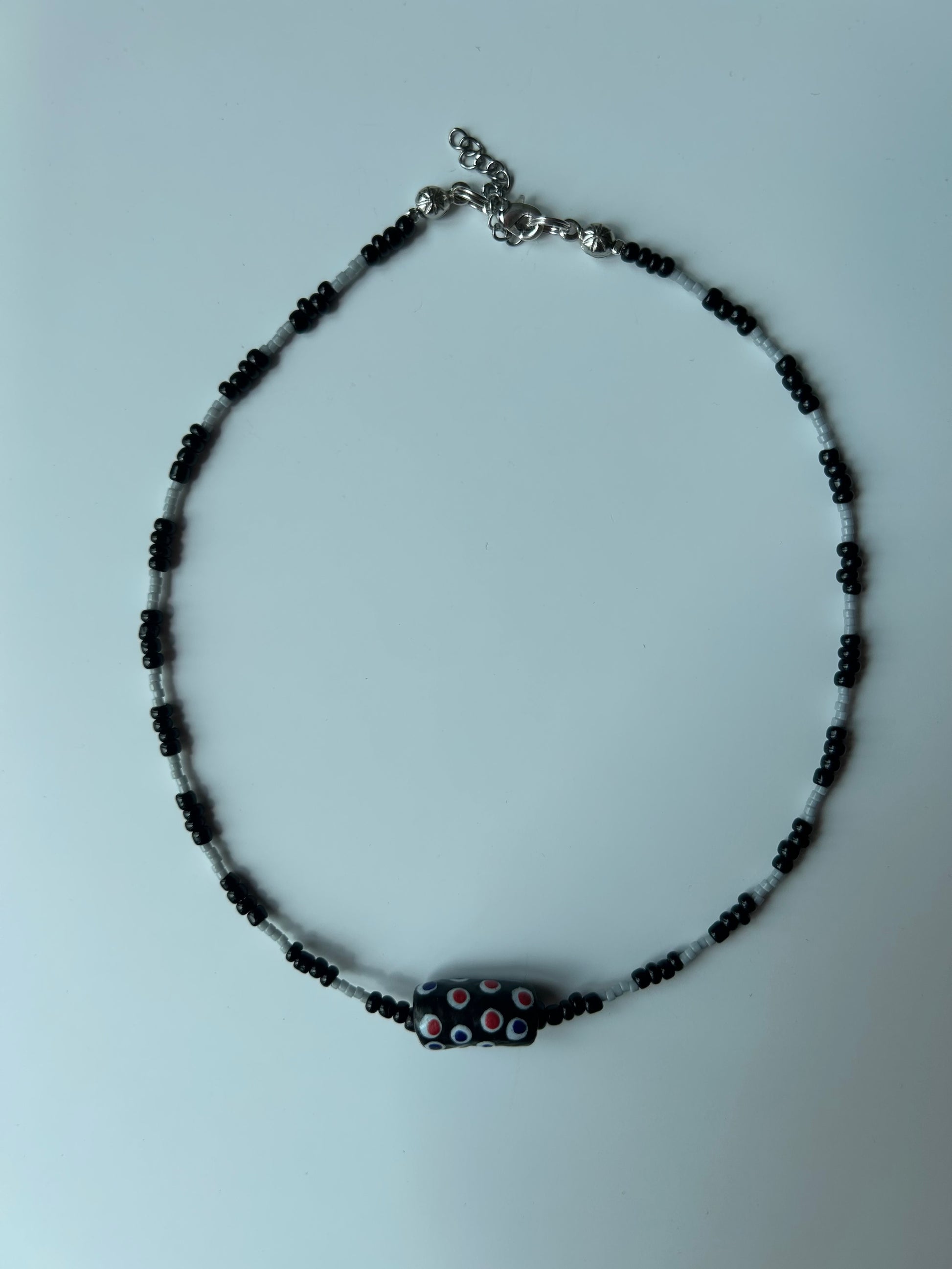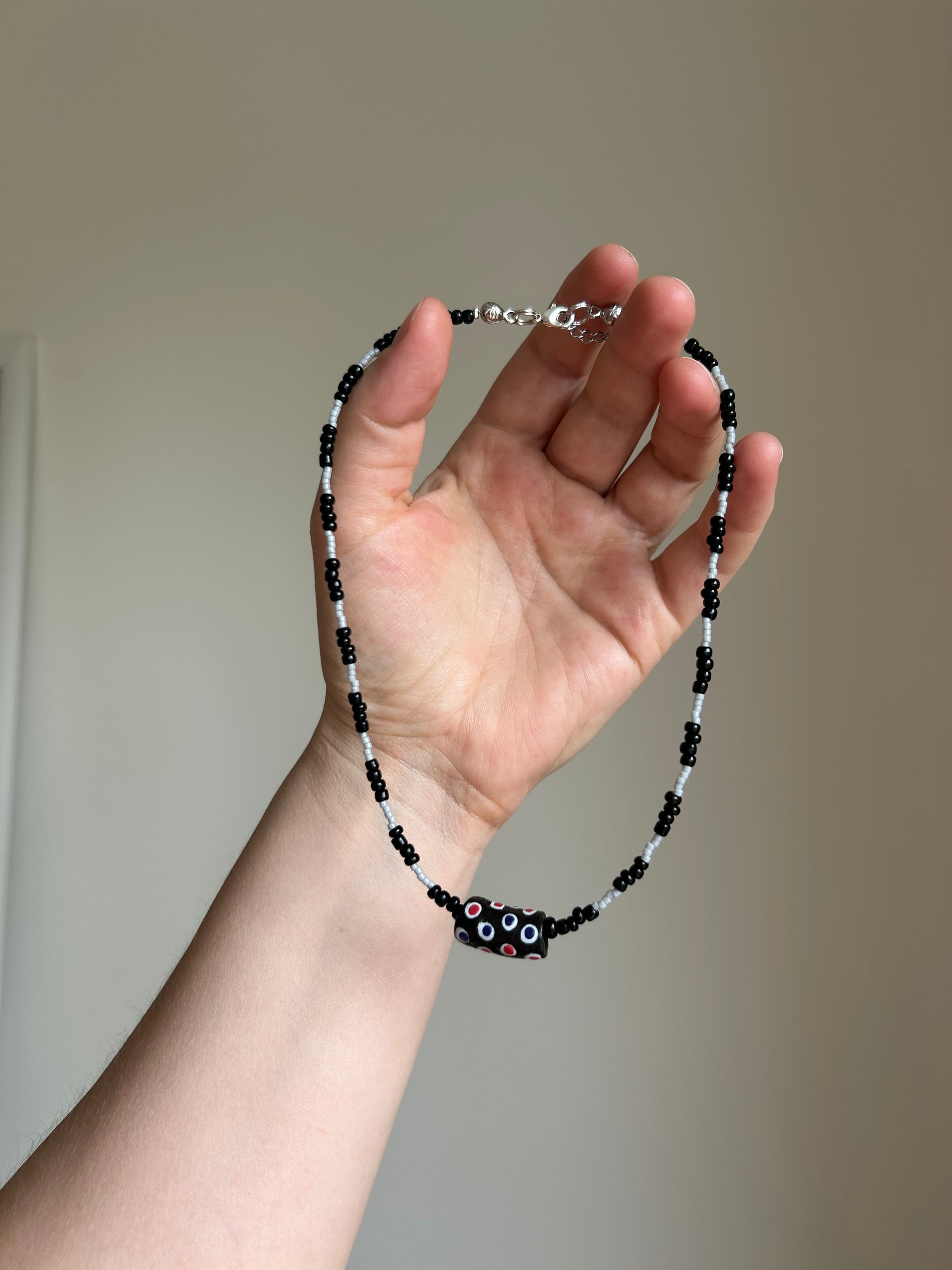 A bold black and grey palette with a statement glass bead at the center.