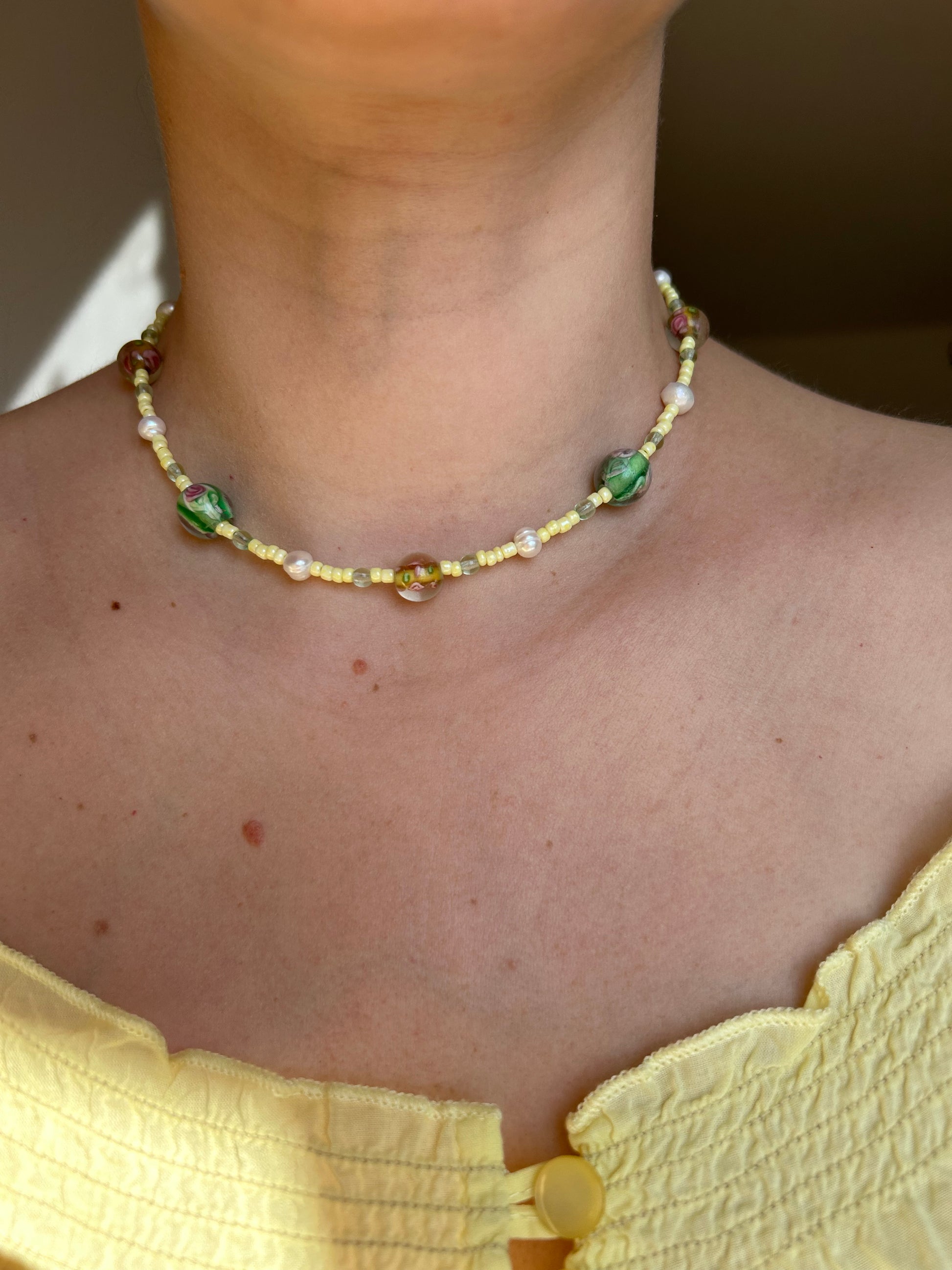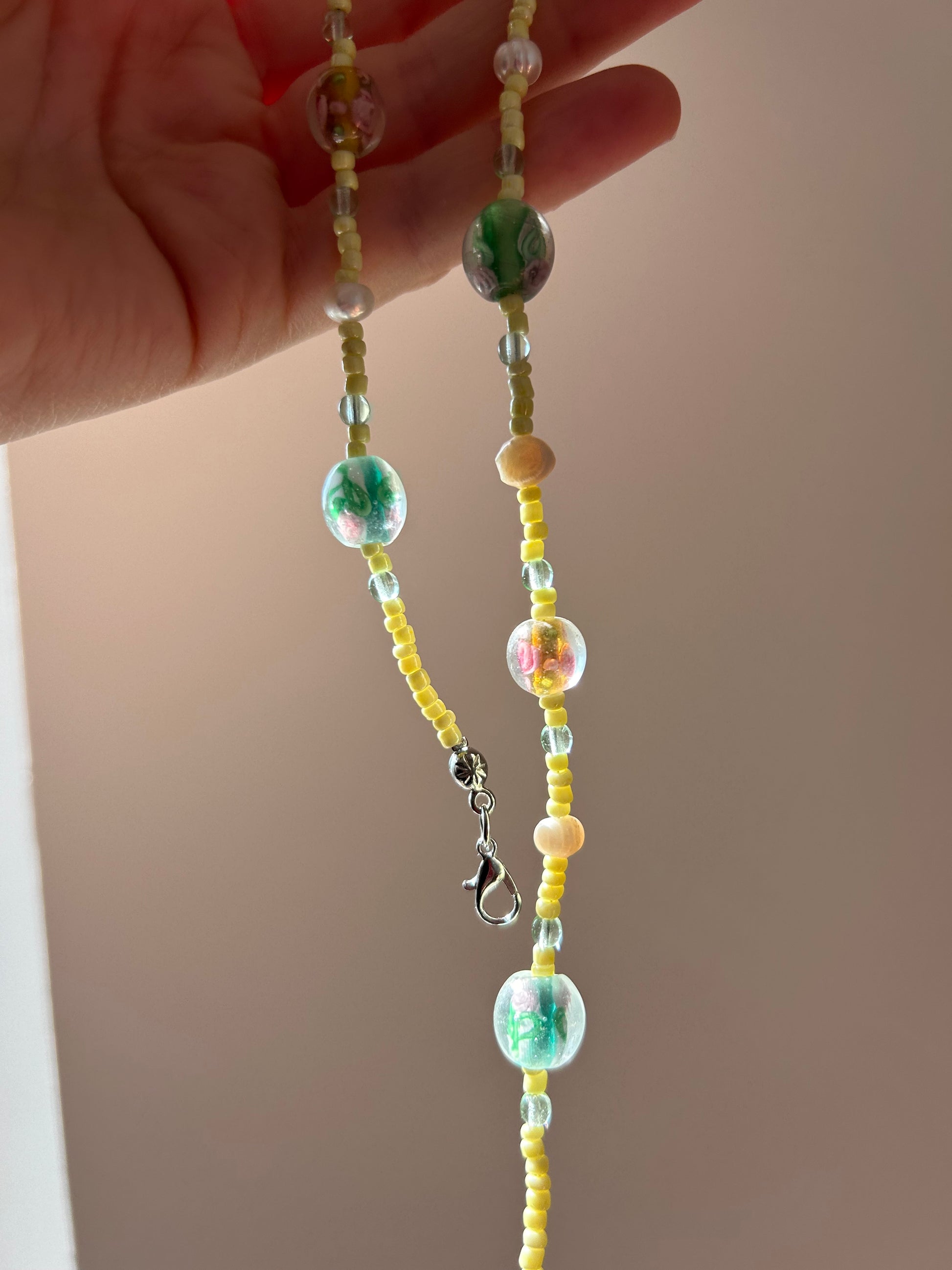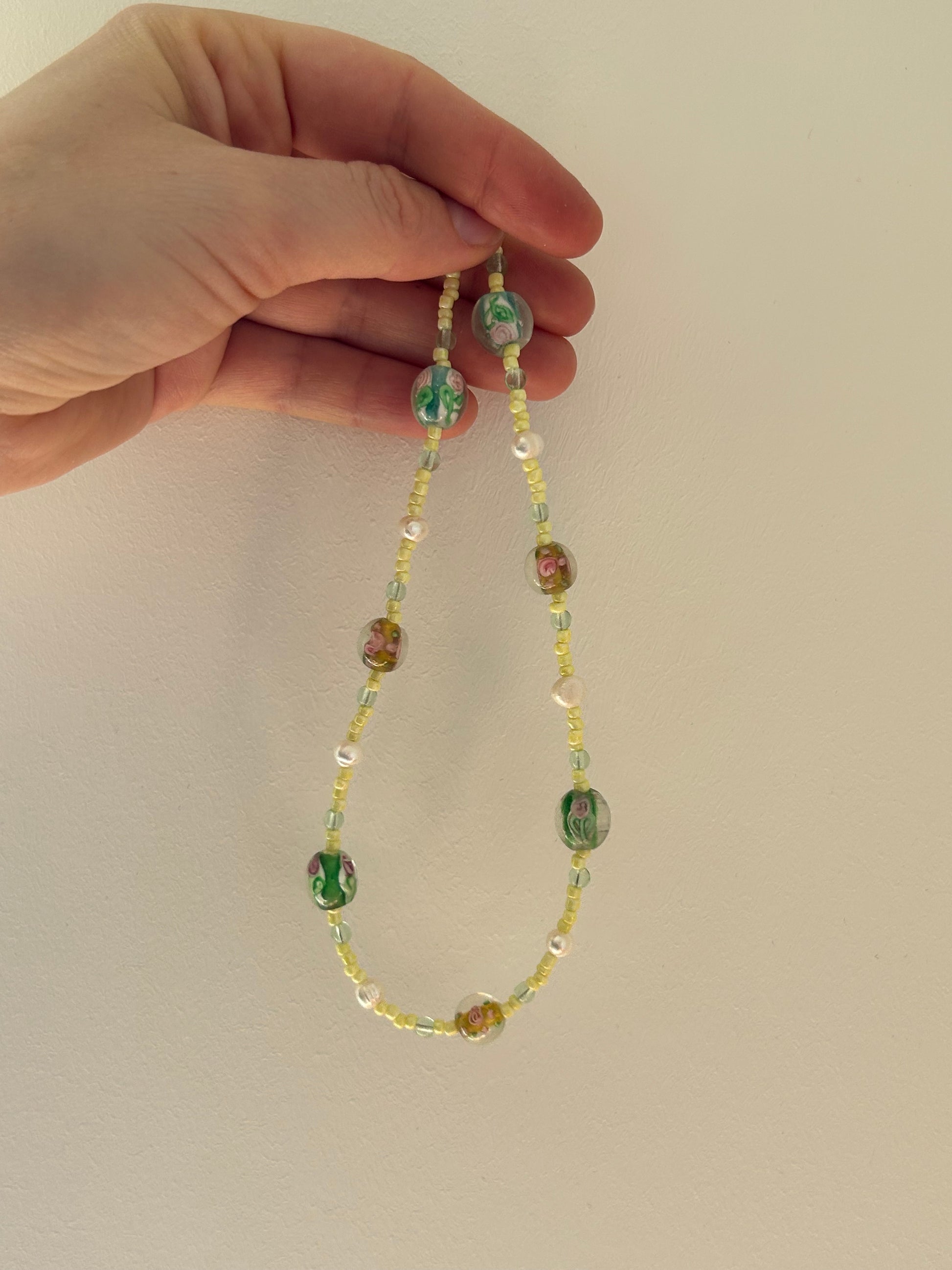 A handmade, one-of-a-kind necklace inspired by a dreamy floral universe. Murano-style glass beads with delicate flower patterns orbit around soft pastel yellow beads and freshwater pearls, creating a piece that feels like a tiny blooming planet around your