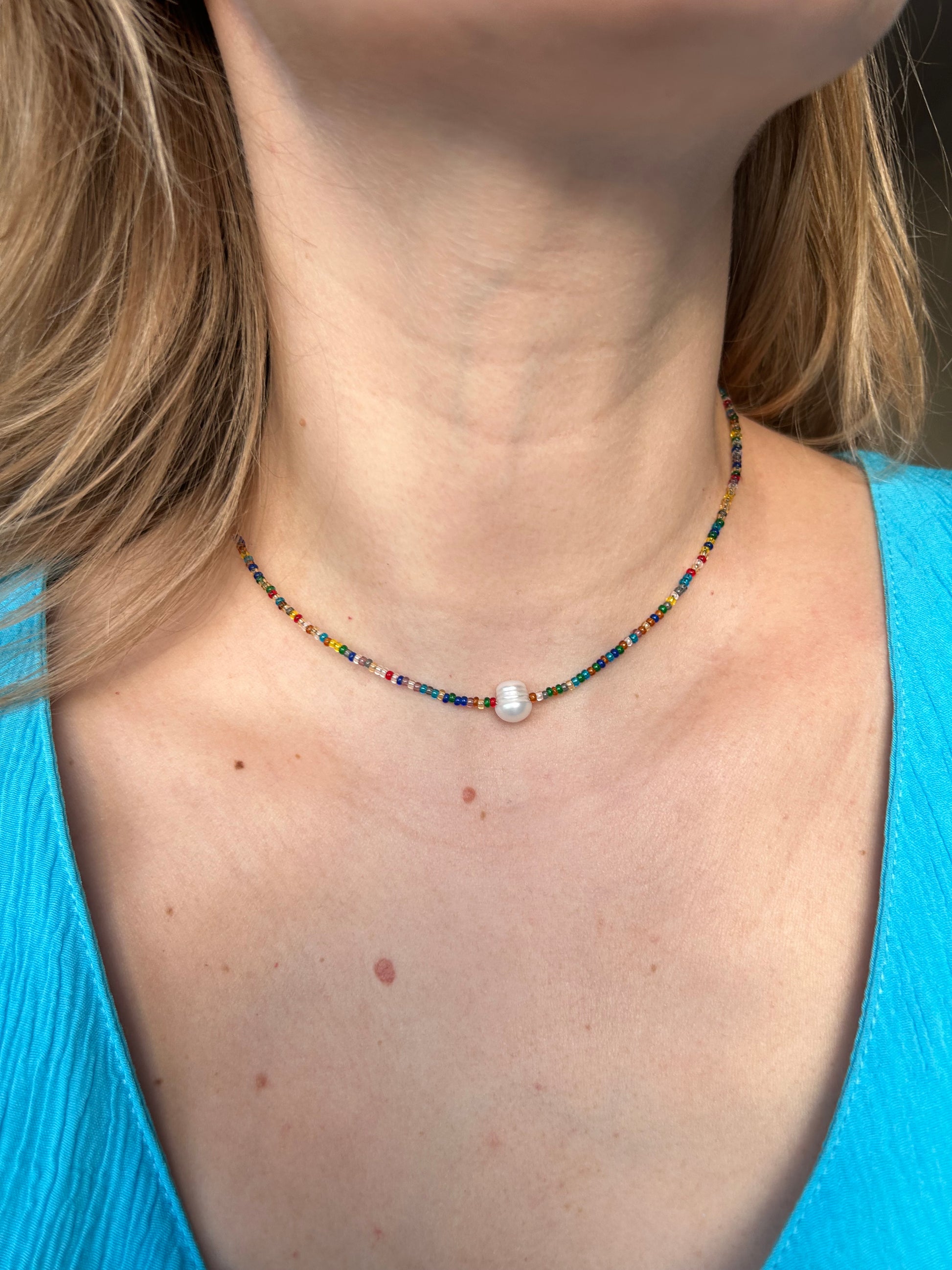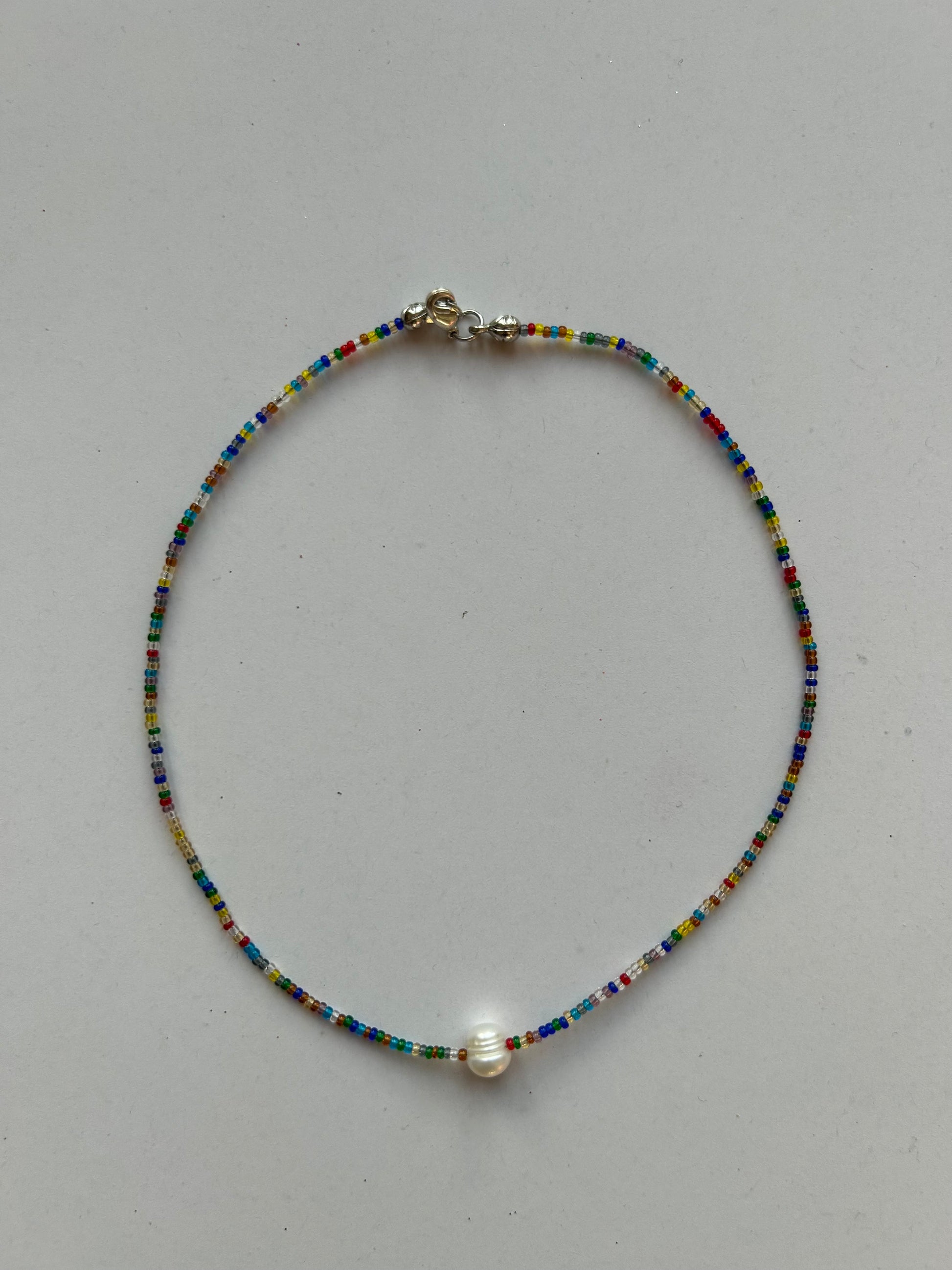 Handmade beaded necklace featuring a delicate mix of multicolored seed beads and a single freshwater pearl at the center. The lightweight and minimalist design measures 38 cm in length and is strung on durable stainless steel wire with a secure clasp.