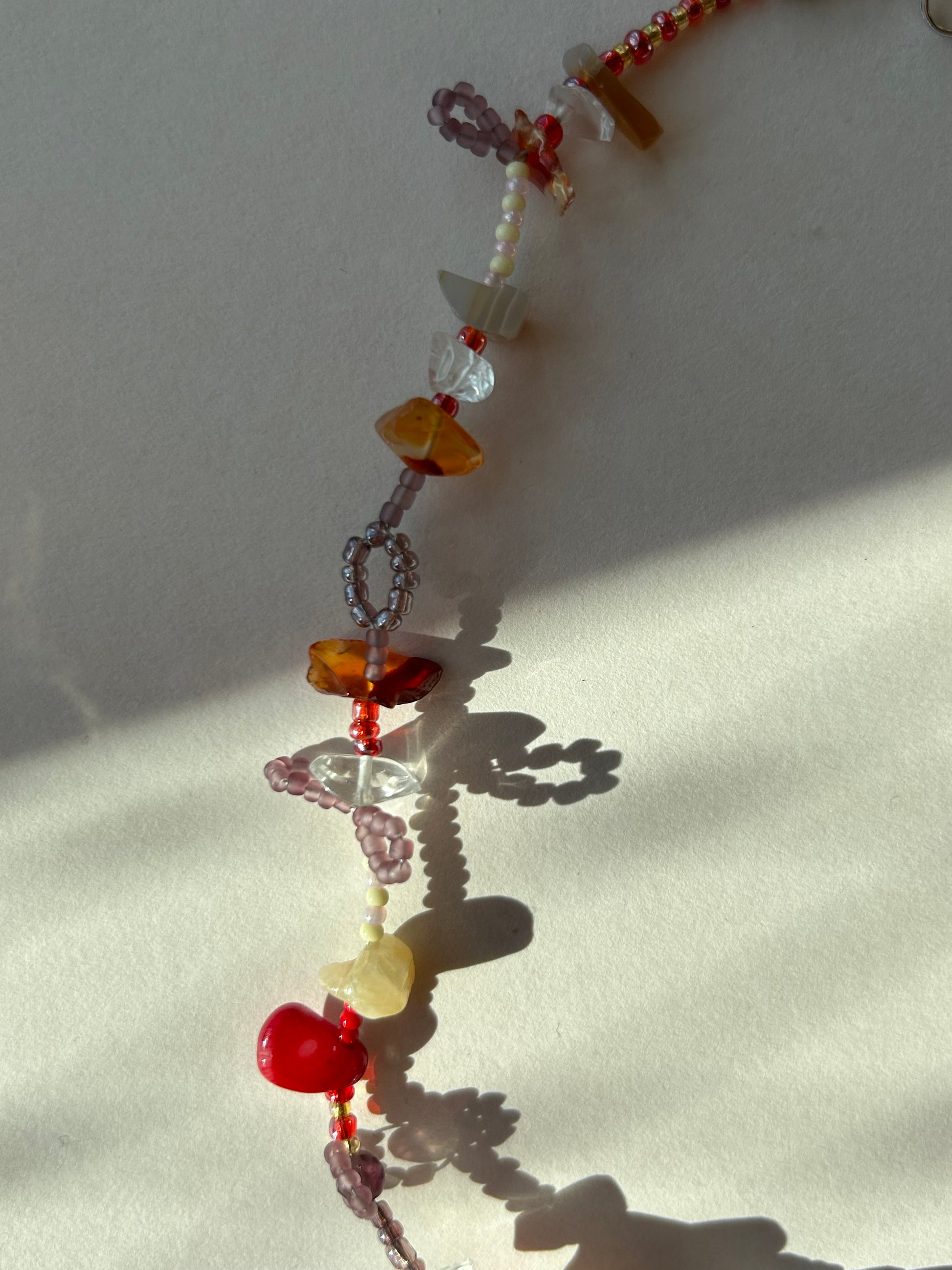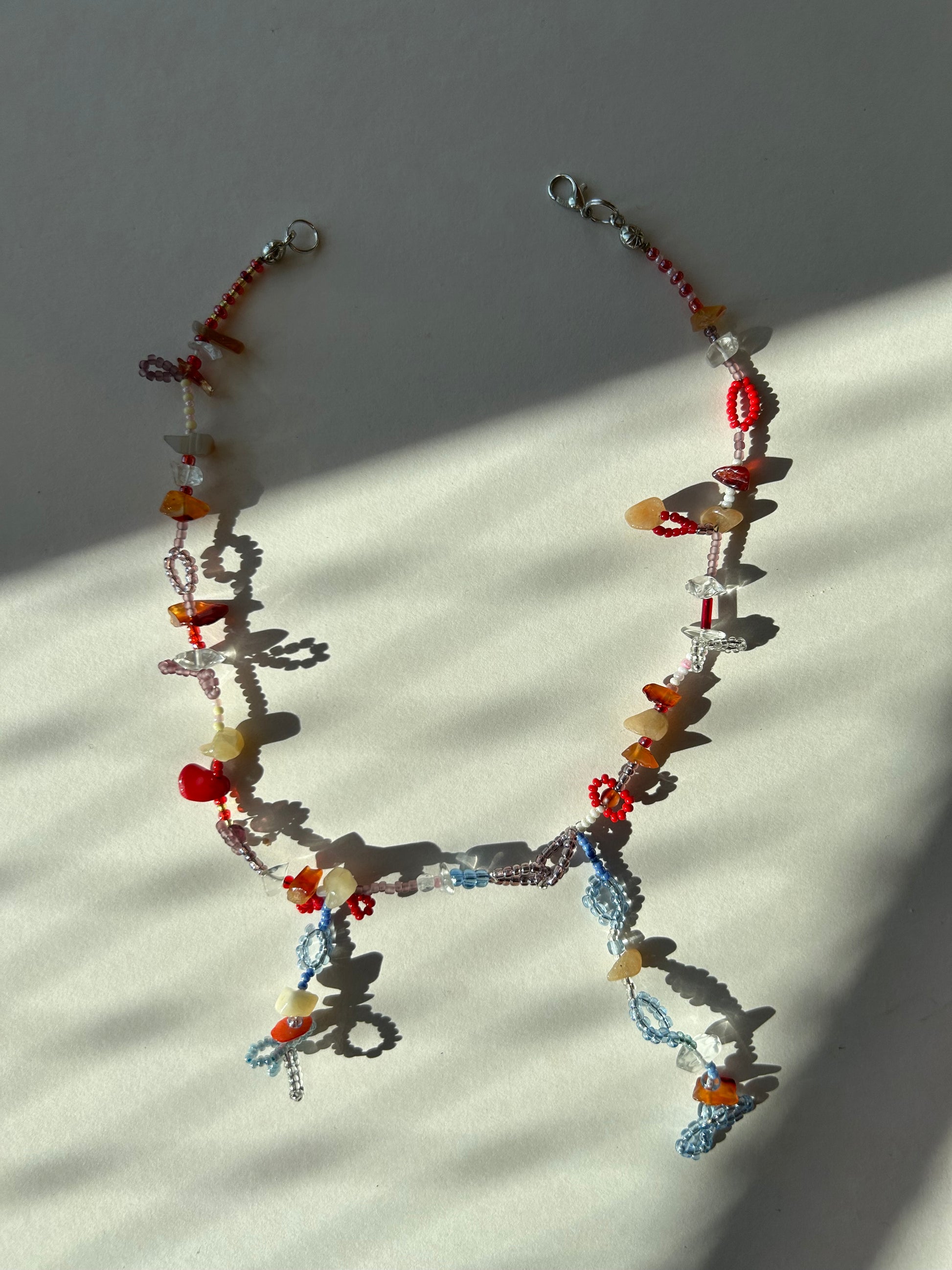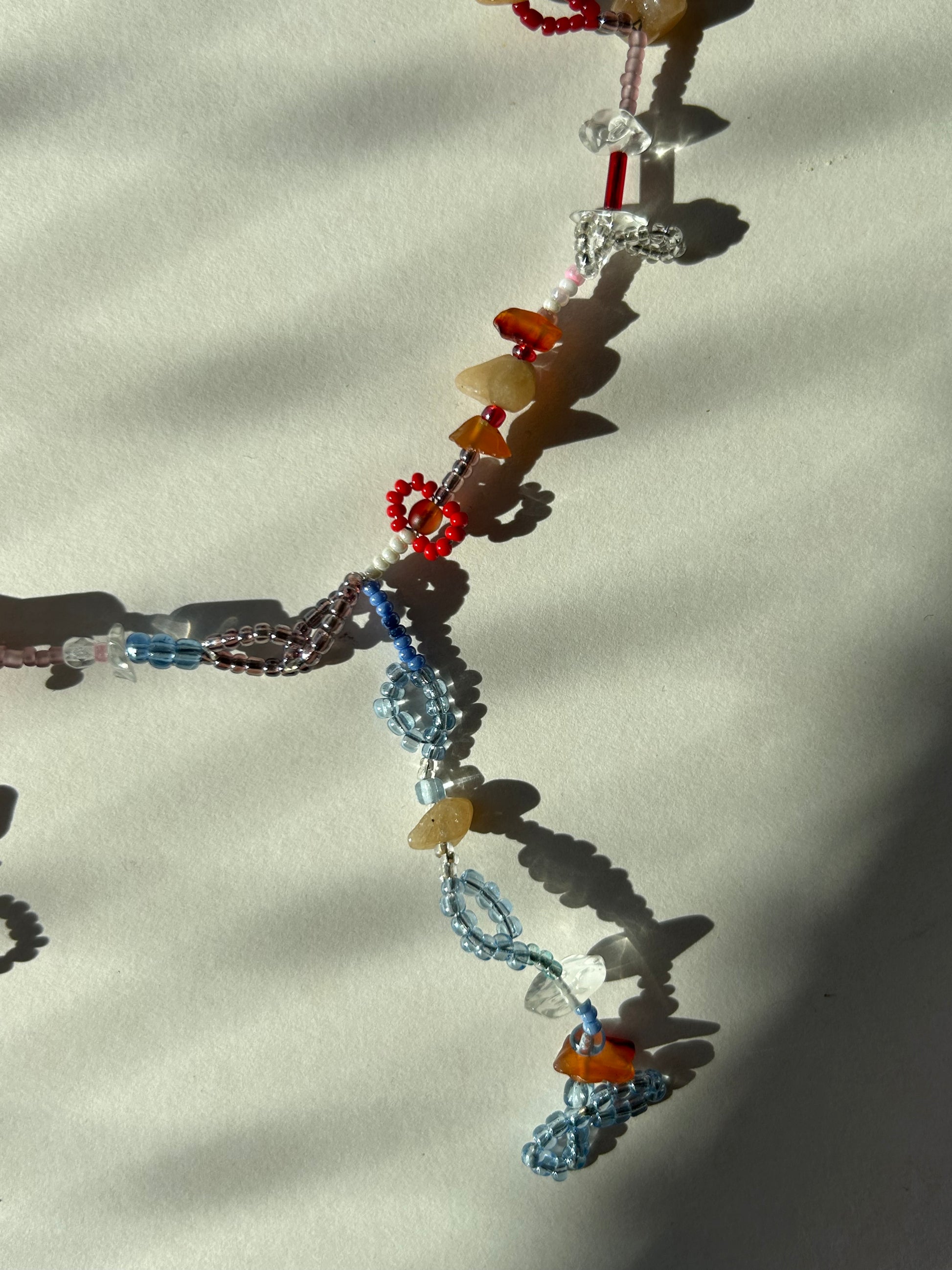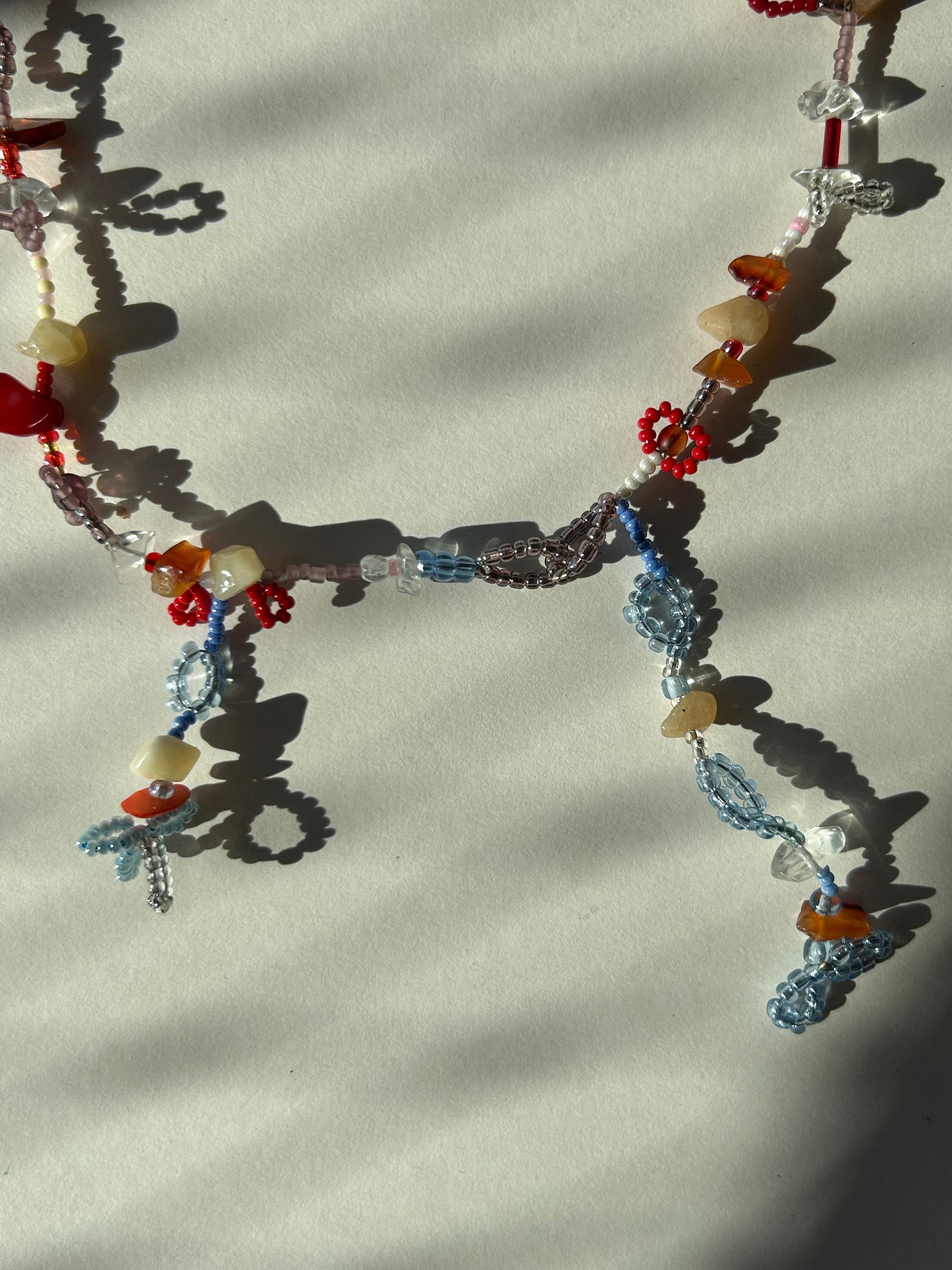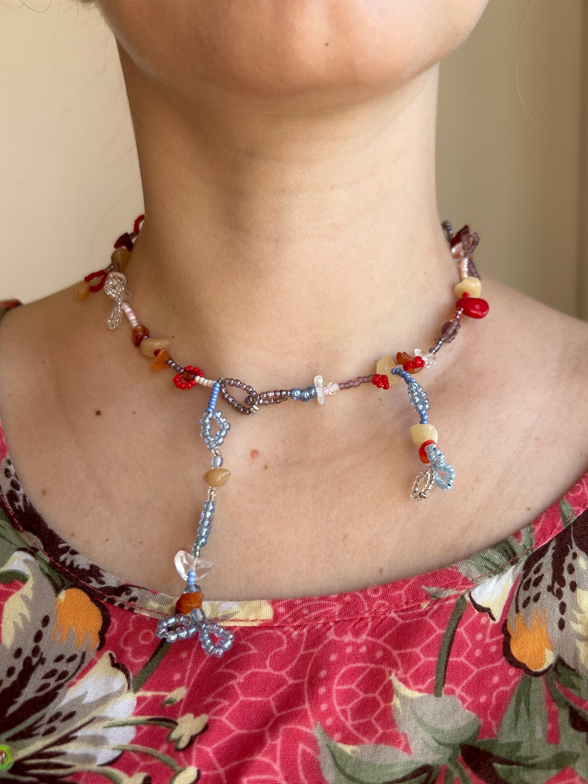 Handmade beaded necklace with an eclectic mix of red, blue, and neutral tones. Featuring intricate beadwork, natural stones, and delicate floral details, this piece embodies a playful and artistic energy. The asymmetrical design gives it a free-spirited, whimsical look. The necklace measures 38 cm in length and is strung on durable stainless steel wire with a secure clasp.
