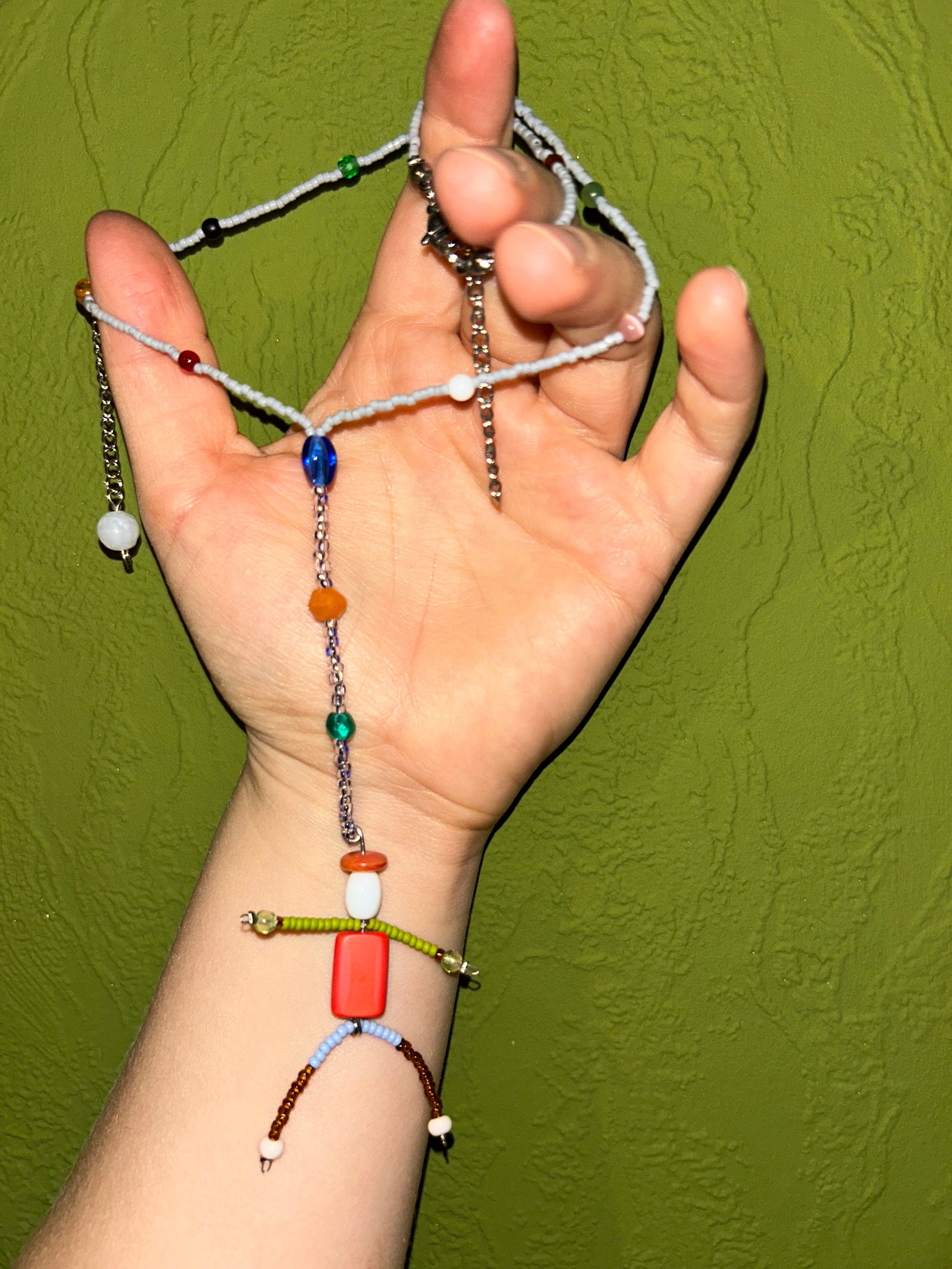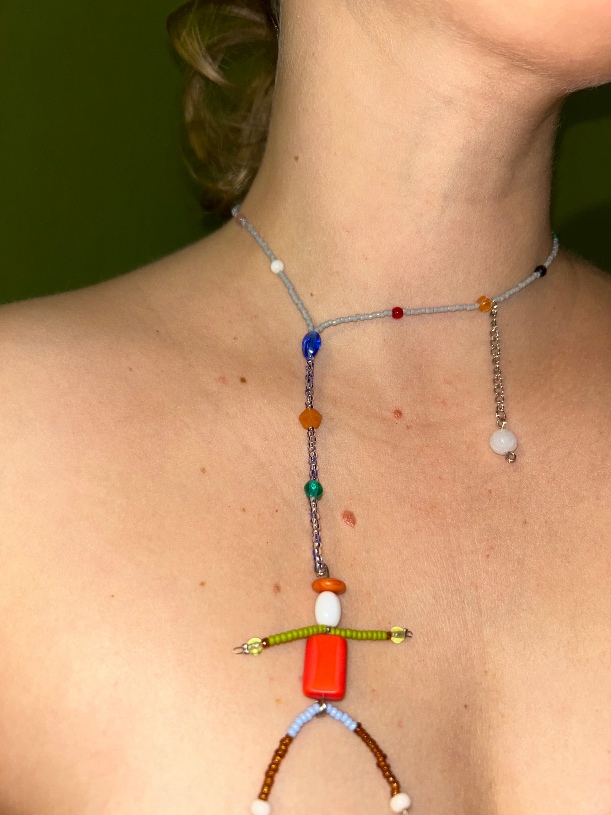 A bold and playful necklace featuring a tiny bead figure that looks like it’s ready to dance right on your chest. Handcrafted with a mix of colorful glass beads and unique shapes, this piece is truly one of a kind. Perfect for those who love quirky, artistic jewelry that makes a statement.