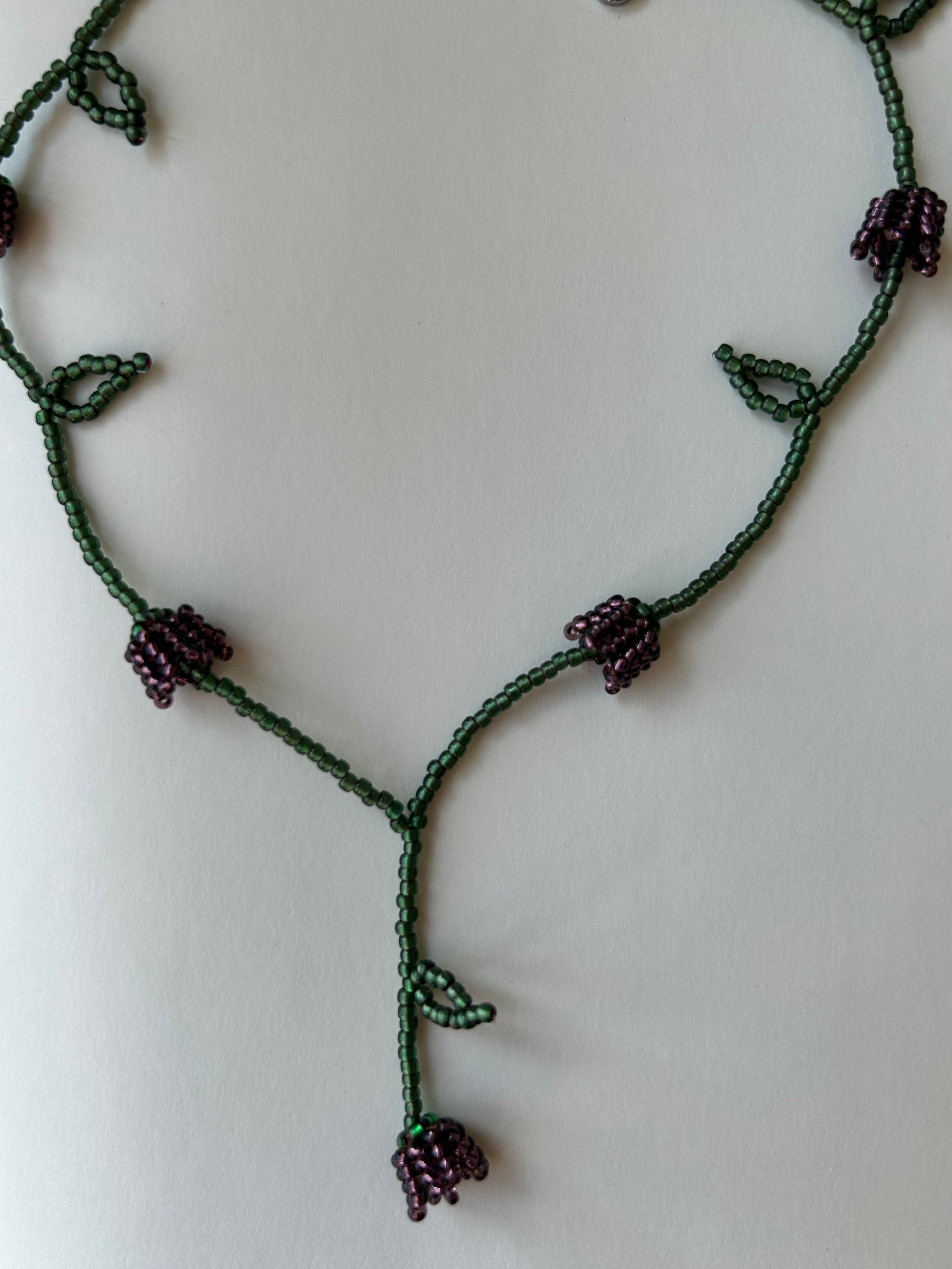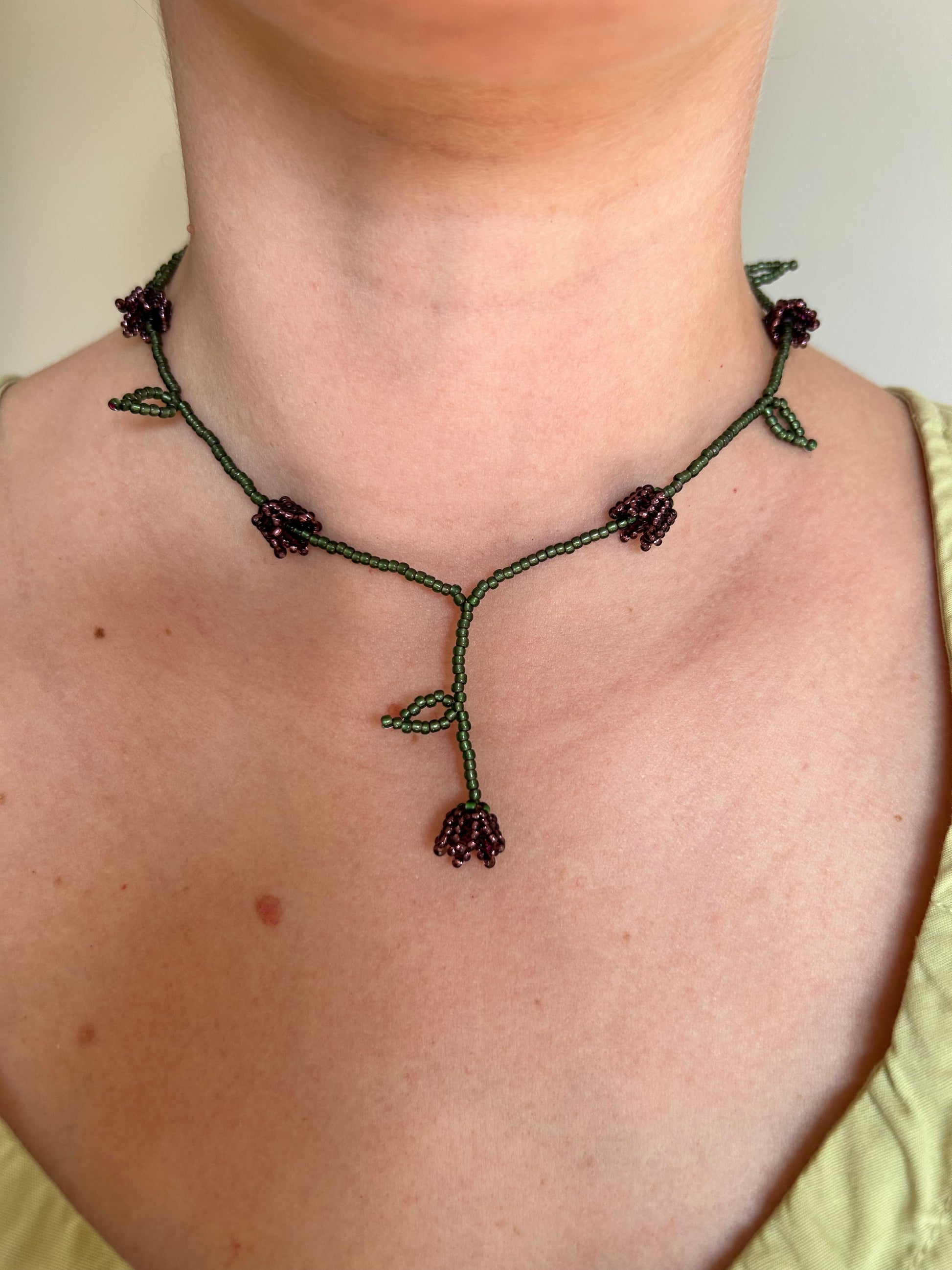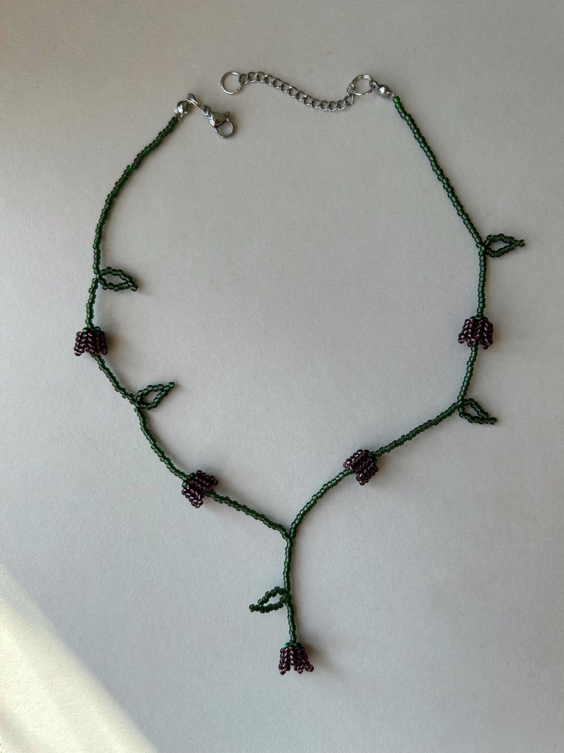 A delicate necklace crafted from premium Japanese glass seed beads, featuring miniature tulip flowers and leafy details.